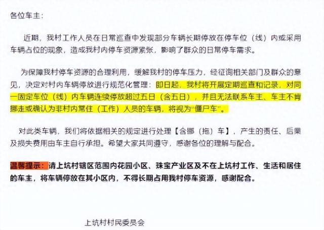 近日,广东省东莞市一村发布“停放超5日认定为僵尸车”的告示,引发关注。