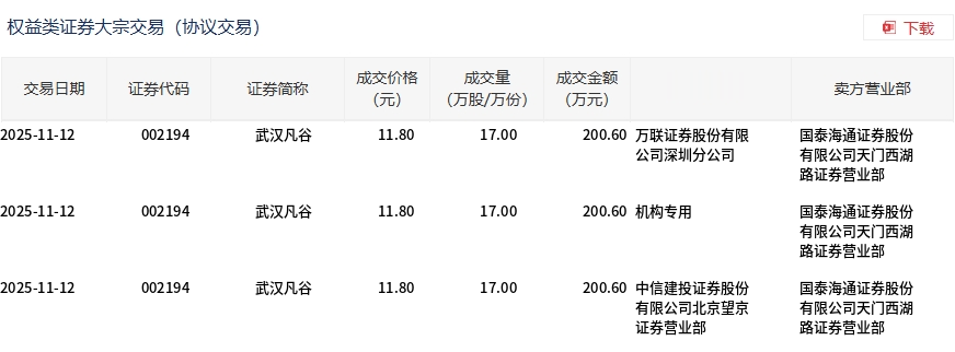 11月12日,武汉凡谷大宗交易成交51万股,成交额601.8万元,占当日总成交额的1.15%,成交价11.8元,较市场收盘价13.56元折价12.98%。