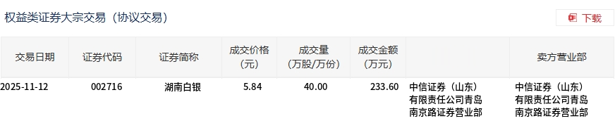 11月12日,湖南白银大宗交易成交40万股,成交额233.6万元,占当日总成交额的0.34%,成交价5.84元,较市场收盘价6.44元折价9.32%。