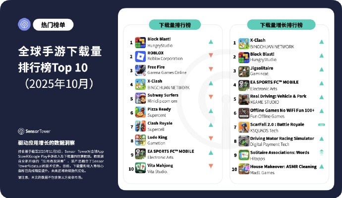 直播吧11月12日讯SensorTower发布2025年10月全球手游收入与下载量数据,2025年10月,全球手游收入达到68亿美元,环比增长4.5%;全球手游下载量达到37.8亿次,环比增长2.2%。