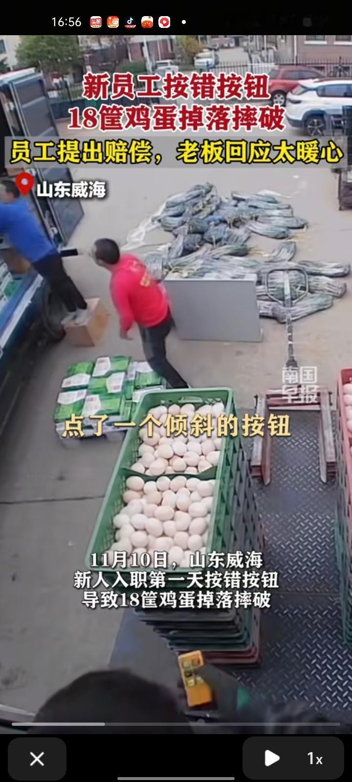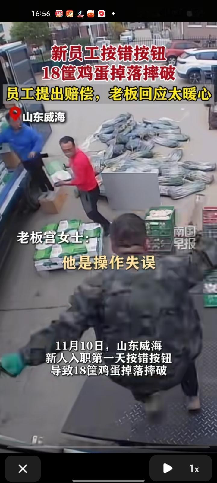 11月8日,山东威海。新来的员工第一天在超市卸货时,不熟悉货车尾板的遥控操作,按下“倾斜”按钮,致18筐鸡蛋从尾板滑落摔碎。经清理发现,仅两筐鸡蛋完好,其余的完全摔碎。 老板宫女士表示,员工说要赔,我们说不用,大家挣钱都不容易。 这种做法能减少员工的心理压力,也更容易赢得员工的信任和忠诚度。这一次犯了错没关系,老板可以给员工讲解机器操作流程,剩下的就是靠他自己了。