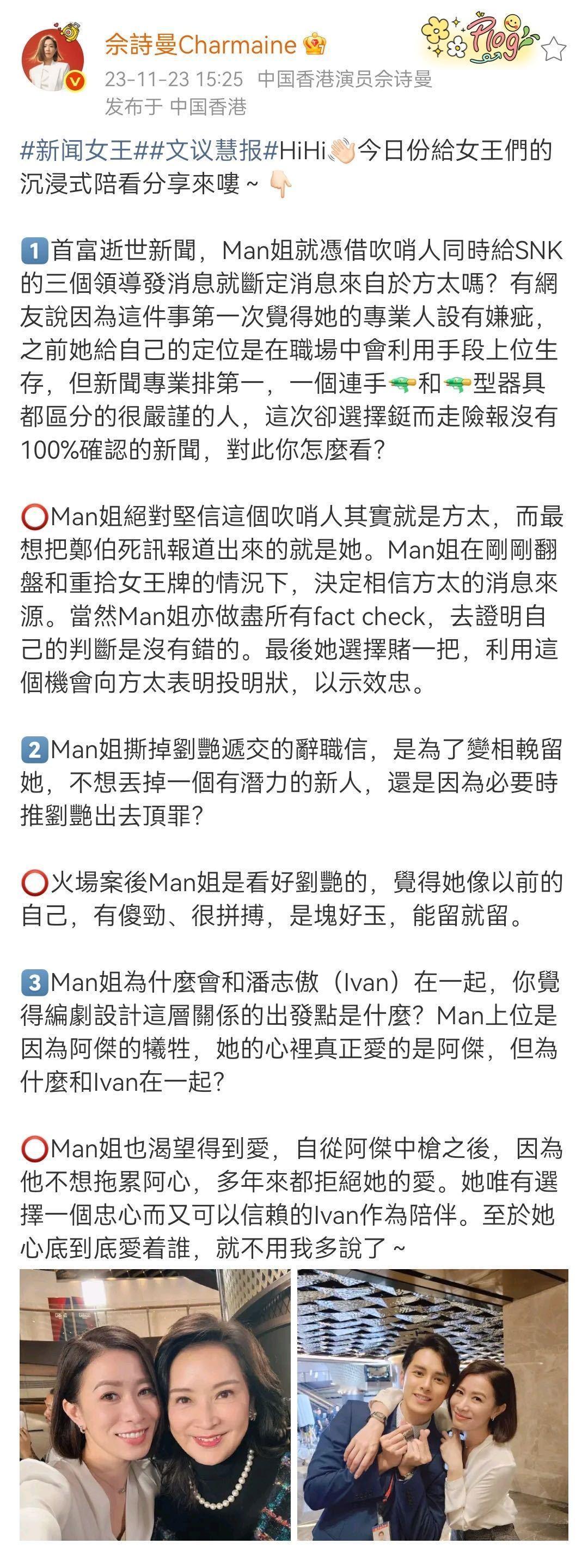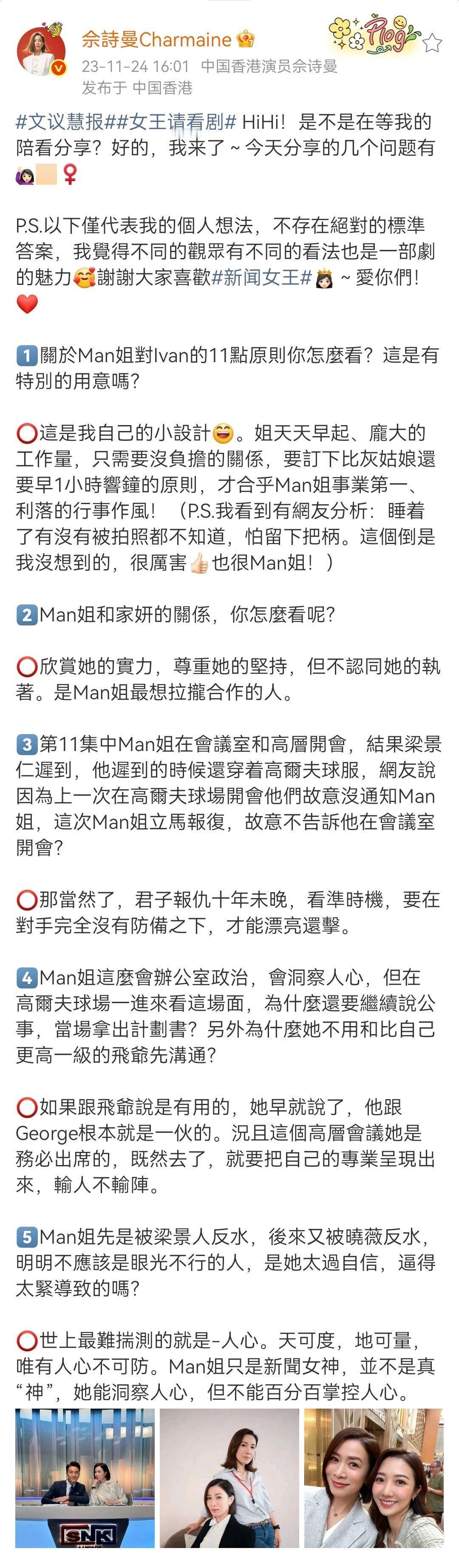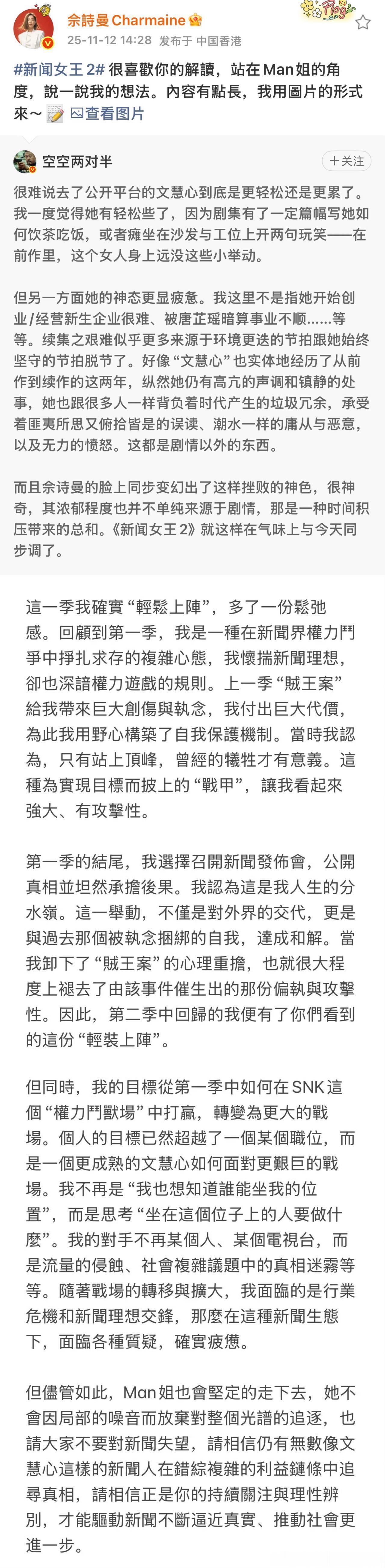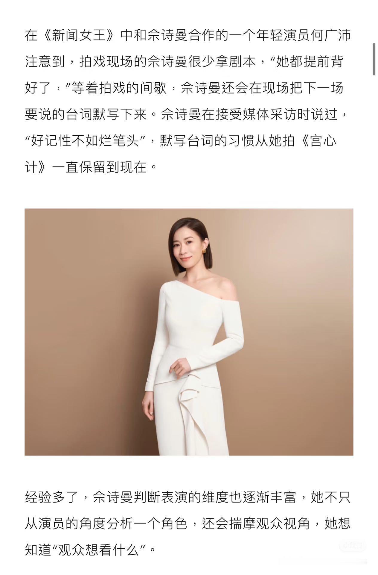 谁能不被佘诗曼的专业度折服!从《新闻女王》到续作,她把“演员”二字刻进骨子里,不只是镜头前闪光,更深入解读角色、和观众探讨剧情。文慧心的沉稳锋利与克制,被她演得宛若重生,台词语气、情绪节奏都恰到好处又自然。这份对表演的真诚与极致执念,让观众感受到被尊重的幸福,有这样的演员,长剧真的有救了!