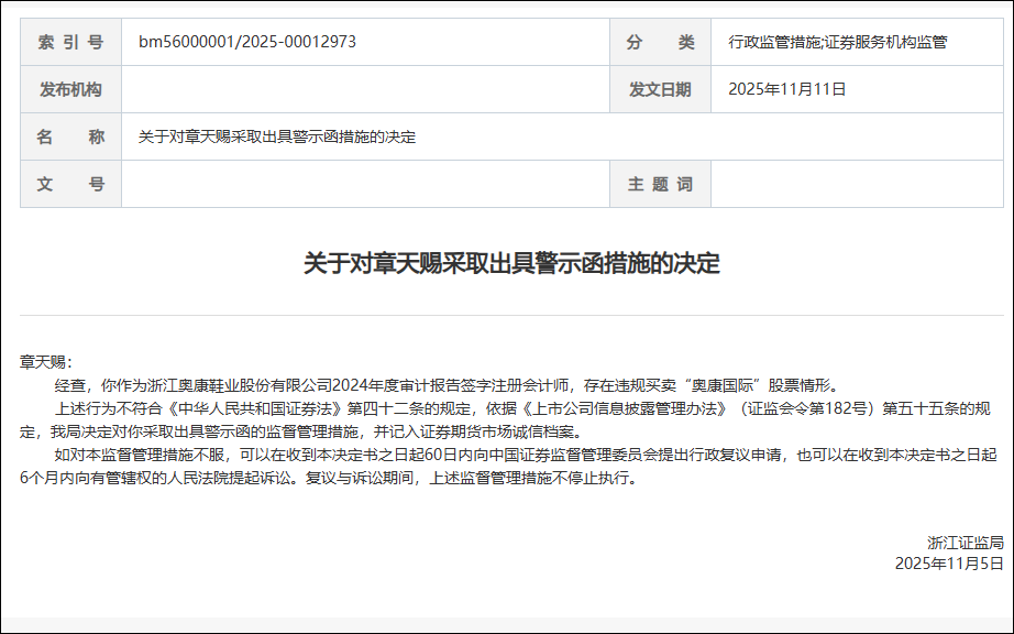 “经查,你作为浙江奥康鞋业股份有限公司2024年度审计报告签字注册会计师,存在违规买卖‘奥康国际’股票情形。”11月11日,浙江证监局对天健会计师事务所注册会计师章天赐采取出具警示函的监督管理措施。