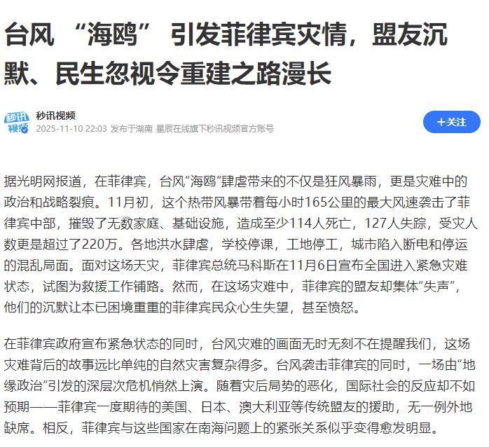 这次菲律宾发生天灾,之所以全世界都选择沉默。主要的原因是大家心里门清,现在菲律宾人的德行。之前有事就求助东大,东大有求必应。结果菲律宾一度过灾难,就各种站队美国。对于这样没有丝毫道德的国家,谁敢往上凑?   2013年那场叫“海燕”的超强台风,把菲律宾刮得一片狼藉,这事谁都没忘。当时第一个冲上去帮忙的就是咱们中国,第一批值一千万人民币的救援物资刚送过去,紧接着又追加了一千万美元的无偿援助。   这里面光现金就有两百万美元,还有整整一万吨大米,全是能救急的东西。咱们的“和平方舟”医院船更实在,直接开到灾区,当场搭起临时医院救人,当时不少菲律宾老百姓都举着“感谢中国”的牌子,在路边打招呼,那场面是真挺感人的。   可咱们这份实打实的好,菲律宾转头就忘到后脑勺去了。灾一过去,之前说的那些感谢话,全成了过期没用的客套。嘴上说着“南海的事儿不找外人插手”,转脸就给美国递上了“投名状”,新开放了好几个对着南海、台海的军事基地,还把美军的“堤丰”中程导弹,挪到了离黄岩岛才270公里的苏比克港。   更让人不待见的是,他们还扯出个荒唐的“交易”说法,胡说什么只要中国从南海岛礁撤走,他们才会把这些武器挪走。   这种“有事就喊东方帮忙,没事就抱美国大腿”的投机劲儿,早就把国际社会的热心给浇凉了。马来西亚总理安瓦尔看得特清楚,直接说南海的问题该咱们地区国家自己解决,外面的势力插进来只会添乱;柬埔寨的学者也点破了关键,那些被菲律宾当成靠山的国家,根本就不想让问题和平解决,只会在旁边拱火。   连菲律宾自己人都看不过去,以前的政要公开骂政府外交“短视又危险”,参议员更担心,说“堤丰”导弹的发射按钮捏在外国人手里,菲律宾搞不好哪天就成战场了。   说真的,国际援助从来不是谁该尽的义务,全凭一份情分。当年缅甸地震,中国、马来西亚这些国家都是第一时间赶去帮忙,菲律宾自己当时也说要派医疗队,说明他们也懂该互相帮衬的道理。   可轮到他们遭灾,为啥没人主动上前?关键就是他们把别人的善意当成了能随便造的筹码,把国家的信誉当儿戏。你今天受了援助,转脸就捅恩人一刀,明天再出事,谁还敢保证自己不会被你这么利用?   得说清楚,咱们中国帮人从来不是图回报,就是出于人道主义,该扛的责任就得扛。但善意也得被尊重啊,国家之间打交道,讲究的是有来有往。菲律宾总想着靠攀附大国耍小聪明,把老百姓的好日子当成地缘上的算计赌注,最后肯定得自食恶果。现在国际上这种“沉默”,说白了就是对他们失信的无声回应,不是不想帮,是不敢帮,更不值得帮。   天灾是没感情的,但人心是热的。菲律宾要是真为自己人着想,就该赶紧停下引狼入室的糊涂事,听听国内外的公道话。说到底,靠抱外人的大腿换不来长久的安全,只有守住诚信,实实在在合作,才能真的渡过难关。不然下次再碰上风雨,可能真就得自己硬扛了。