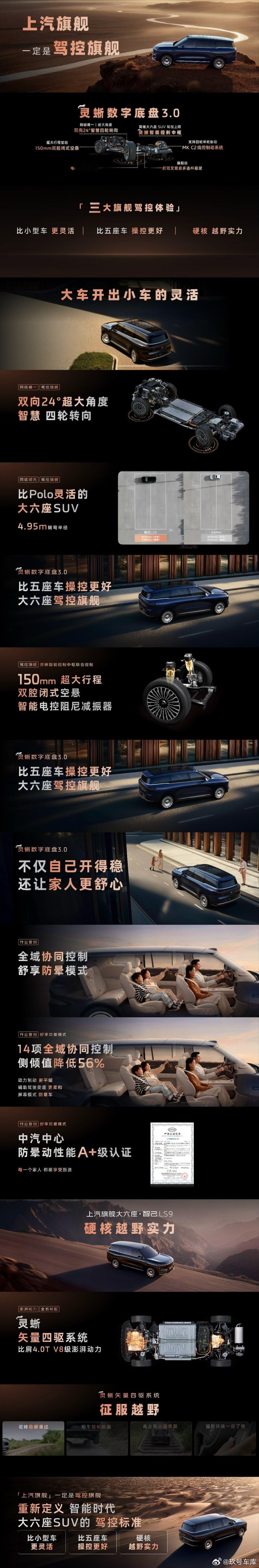 上汽旗舰,一定是驾控旗舰搭载全面进化的灵蜥数字底盘3.0比小型车更灵活,比五座车操控更好第一,一辆全尺寸SUV比小型车更灵活>同级唯一双向24°智慧四轮转向转弯半径只有4.95m让一辆大六座SUV开出小型车的灵活第二,一辆大六座SUV比五座车操控更好>150mm超大行程双腔闭式智慧空气悬架和智能电控阻尼调节系统与灵蜥智能控制中枢联合控制让一辆大六座SUV比五座车侧倾更小,操控更稳不仅开得稳,还让家人坐得舒心>全域协同控制舒享防晕模式侧倾比普通舒适模式进一步减少56%,过弯更稳中汽中心官方认可,获最高A+级“防晕动”权威认证第三,超越想象的硬核越野实力>全系配备灵蜥矢量四驱系统让你自信精准控制这台大六座SUV的强大动力野外复杂路况、乱石驼峰路、连续高台攀登稳稳通行>全新AI越野补盲车身周围越野环境,一目了然应对各种复杂路况,游刃有余智己LS9,重新定义智能时代旗舰大六座SUV的驾控标准!