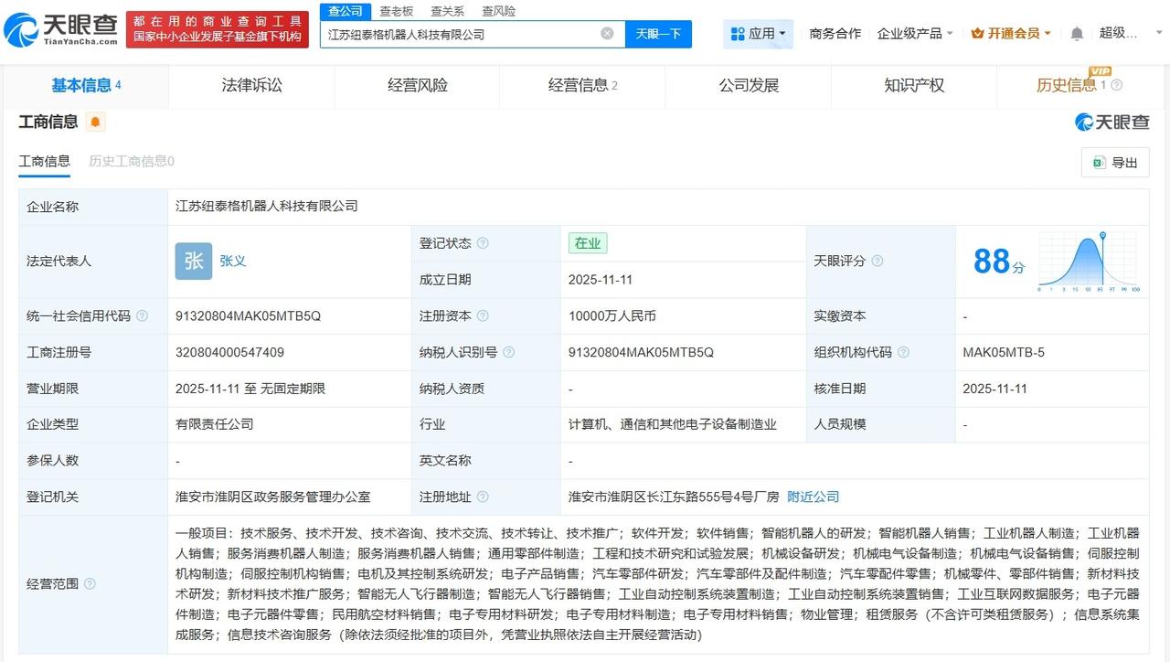纽泰格1亿成立机器人公司 天眼查App显示,近日,江苏纽泰格机器人科技有限公司成立,法定代表人为张义,注册资本1亿人民币,经营范围包括软件开发、软件销售、智能机器人的研发、工业机器人制造等。股东信息显示,该公司由纽泰格全资持股。 天眼查信息: