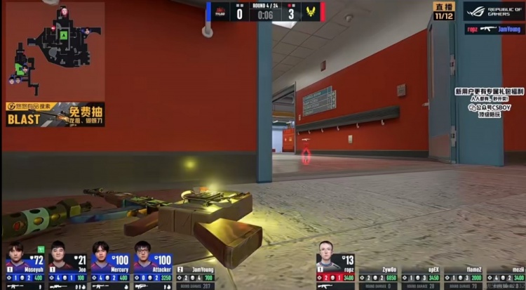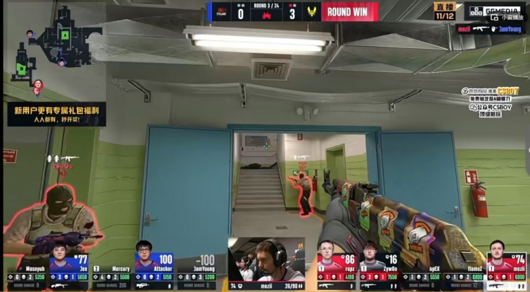 第十一局第一波双方1换1,Mercury踩火从三楼下支援到位自己双杀!Jee大狙架死ZywOo!ropz的1V4残局无能为力!比分来到8-3!