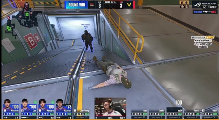 第七局VIT想静步直接打接触,但是Moseyuh顶铁门近点直接三杀顶住局势!ropz单人挂链接刚刚转头就被JamYoung逮捕!4-3!