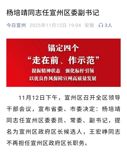大皖新闻讯“今日宣州”消息,11月12日下午,宣城市宣州区召开全区领导干部会议,宣布省委、市委决定:杨培靖同志任宣州区委委员、常委、副书记,提名为宣州区政府区长候选人,王宏峥同志不再担任宣州区政府区长职务。