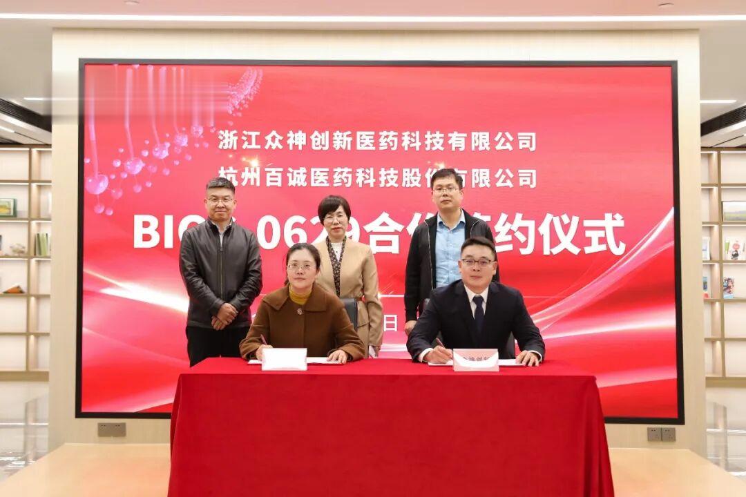 签约仪式上,百诚医药创新药研发中心总经理苗雷博士与众神创新副总经理谢小亮代表双方签署协议。合作双方确定,合同签订并完成资料交接后,众神创新支付3,000万元首付款,后续根据研发节点支付里程碑款共计3亿元。合作产品在大中华区上市后,百诚医药享有销售收入10%的分成收益。