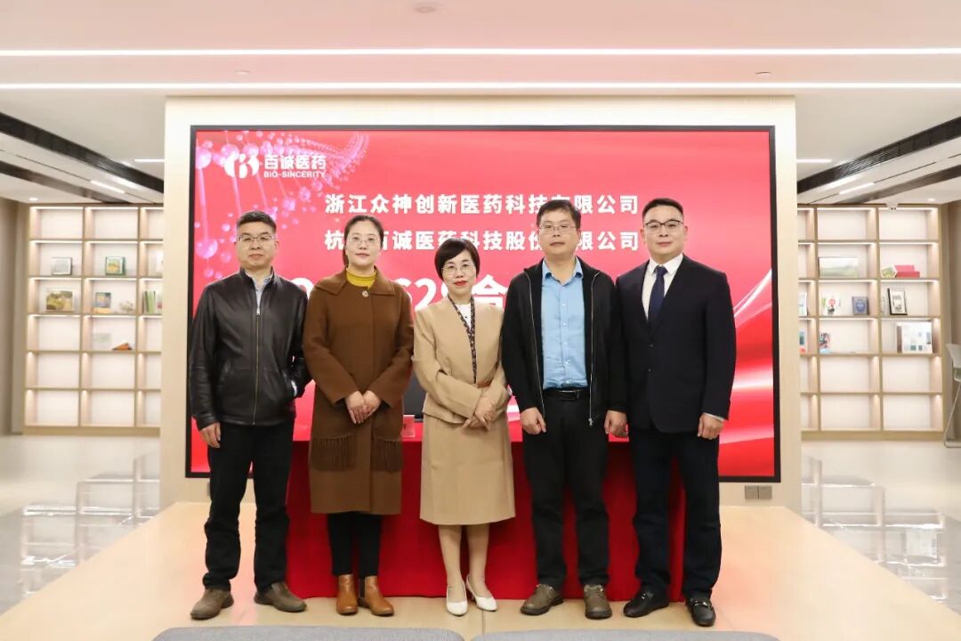 百诚医药董事长、总经理楼金芳,众神创新总经理冯恩光,以及百诚医药首席科学家王江海博士出席并共同见证此次签约。