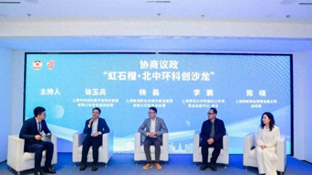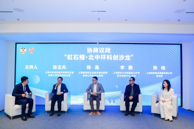 在“虹石榴·北中环科创沙龙”环节,中科润达常务副总经理徐玉兵、临港新业坊总经理杨磊、虹口中学校长李鹏、轶帆物业管理有限公司总经理陈晓展开跨界对话,共同探讨北中环创新生态建设的路径与前景。