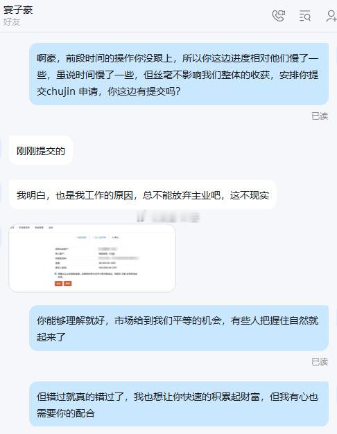 祝贺百万战队宴先生首次提交4.8w收米申请宴先生加入实盘也快有一个月的时间了,说实话面对近段时间的行情,一个月才帮助宴先生达到提交收米申请的条件,多多少少都有点惭愧,毕竟比他后跟上团队的郭先生都已经完成两次提交收米申请的目标,而宴先生才是第一次。当然并非叶生我偏心,而是分享的许多单子宴先生大部分都跟不上。因为宴先生平日的工作比较忙,加上刚加入团队时拿下了丰厚的成果,宴先生从中知晓了叶生团队的实力,知晓叶生我不会跑自然就没有那么着急的想要捕捉每一波行情,而是将重心放在自己的主业上面,交易则选择在有空闲的时间做,才导致抵达目标的时间拖那么久。中国有句老话叫:好饭不怕晚、良缘不怕迟,虽然我们时间拖得久一些,但我们的所抵达的目标却是一致的,再次祝贺宴先生!
