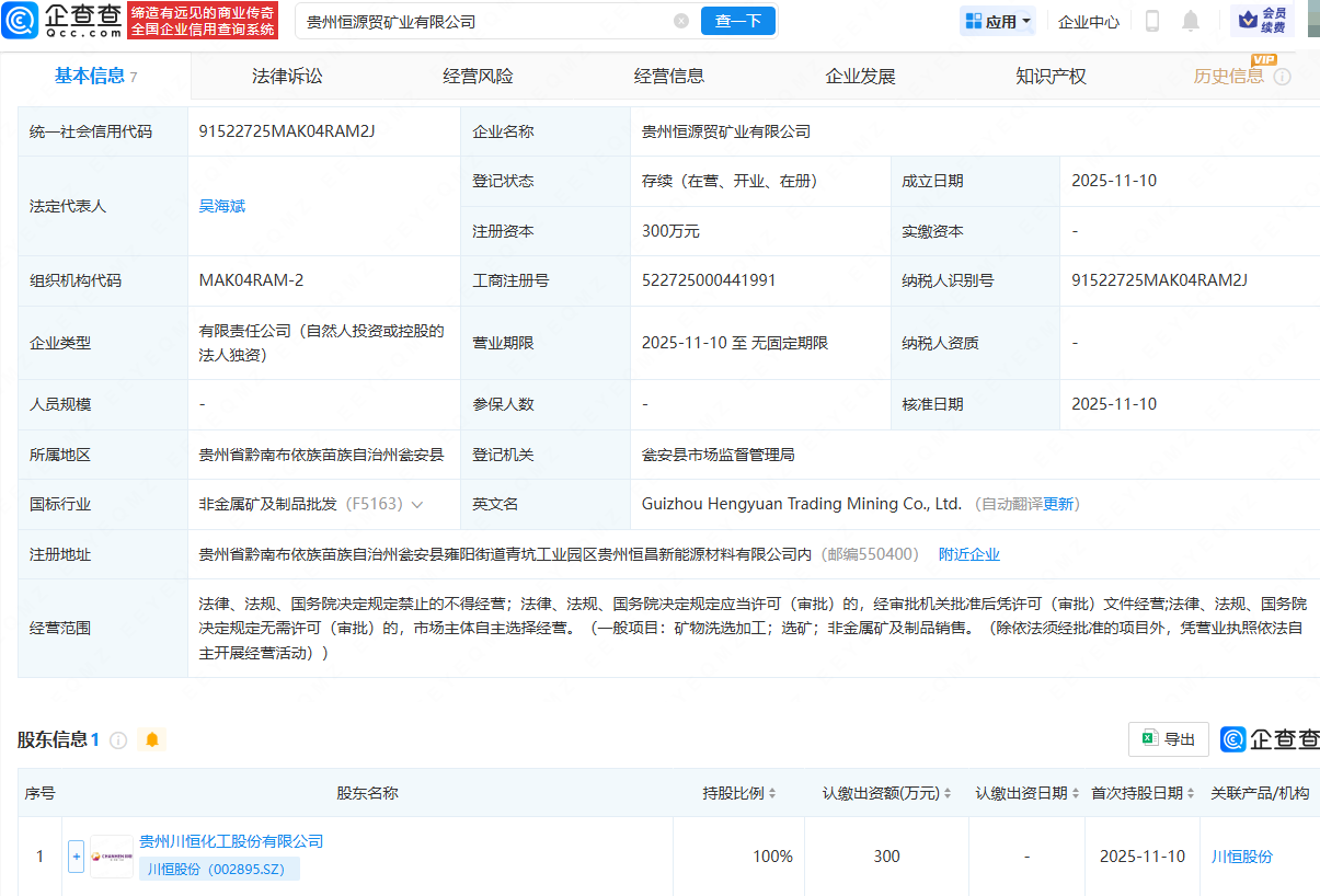 企查查APP显示,近日,贵州恒源贸矿业有限公司成立,法定代表人为吴海斌,经营范围包含:矿物洗选加工;选矿;非金属矿及制品销售。企查查股权穿透显示,该公司由川恒股份(002895)全资持股。