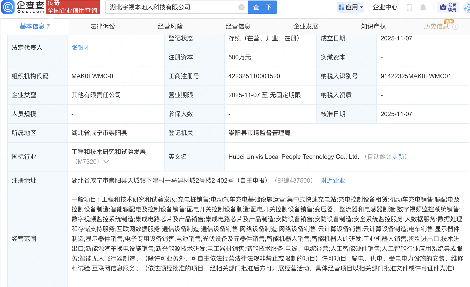 企查查APP显示,近日,湖北宇视本地人科技有限公司成立,法定代表人为张银才,经营范围包含:集成电路芯片及产品制造;智能机器人销售;智能机器人的研发;人工智能硬件销售;人工智能行业应用系统集成服务;智能无人飞行器制造等。企查查股权穿透显示,该公司由千方科技(002373)旗下浙江宇视科技有限公司等共同持股。