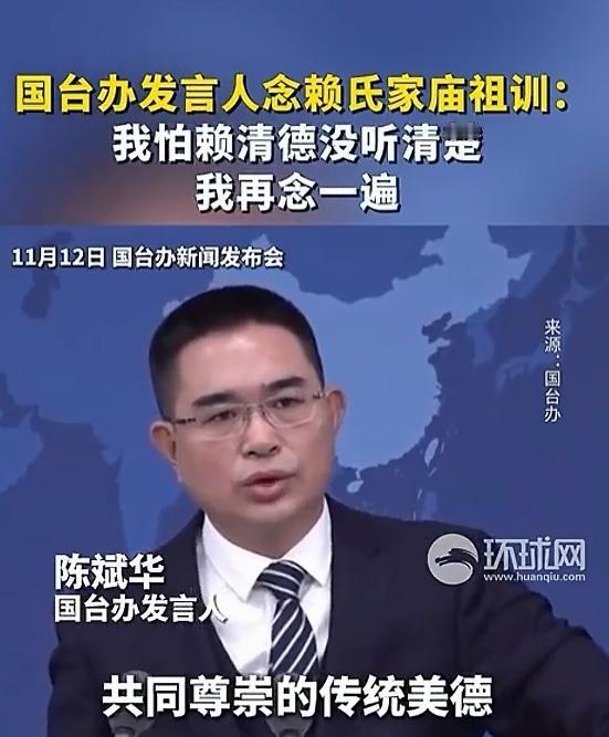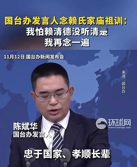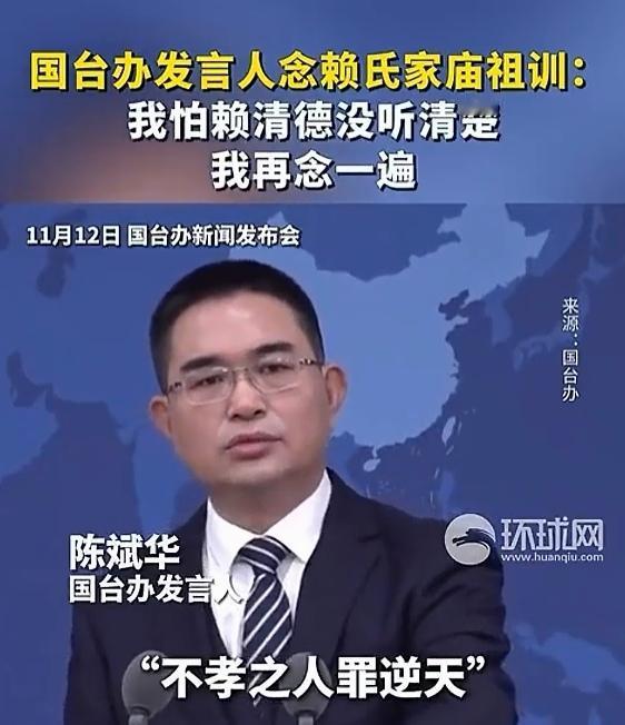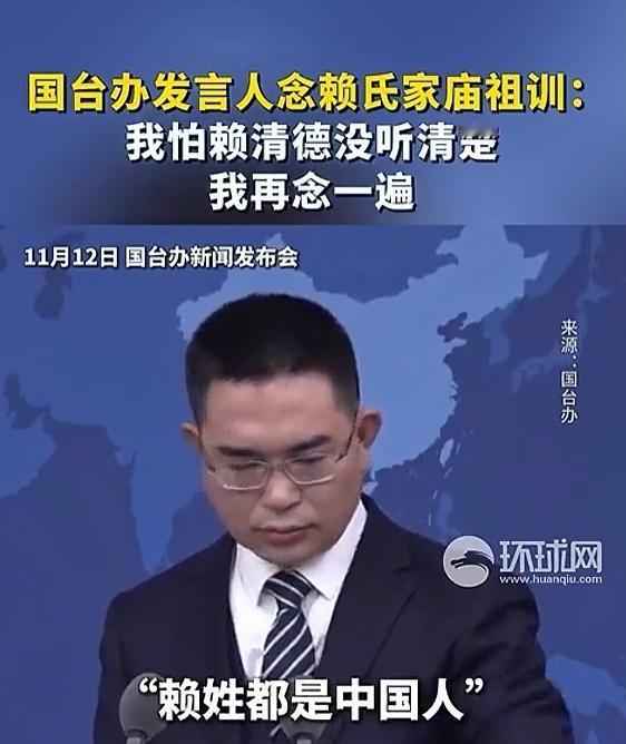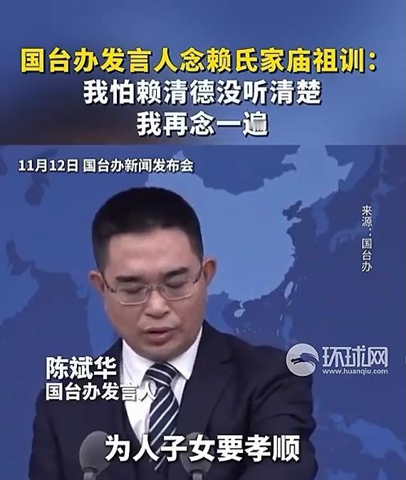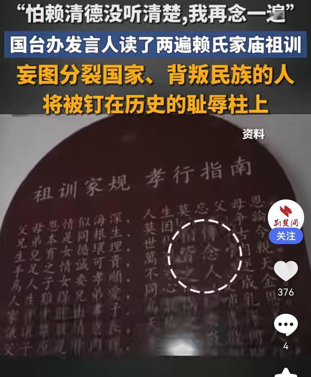 重要的事重复两遍! “为人子女要孝顺,不孝之人罪逆天!” “为人子女要孝顺,不孝之人罪逆天!” 这是赖氏家庙石碑上镌刻着的祖训,是祖上留下的最珍贵的财富,估计父辈之上每日诵读,并教导后代,引以为荣,引以为戒。 国台办喊话赖清德,将其宣读了两遍,并举例台北市区干道之一就是忠孝西路、忠孝东路,这条路上的忠孝、信义、仁爱、和平,都是4条主要干道。 福建省赖氏宗亲会秘书长也喊话赖清德:台湾赖氏的根就在大陆。不承认祖宗,不承认祖国,就是逆天之罪。 赖姓根在大陆,祖坟在大陆,无可反驳的真相,更是赖不掉的,劝其迷途知返,回头是岸! (来源环球网)