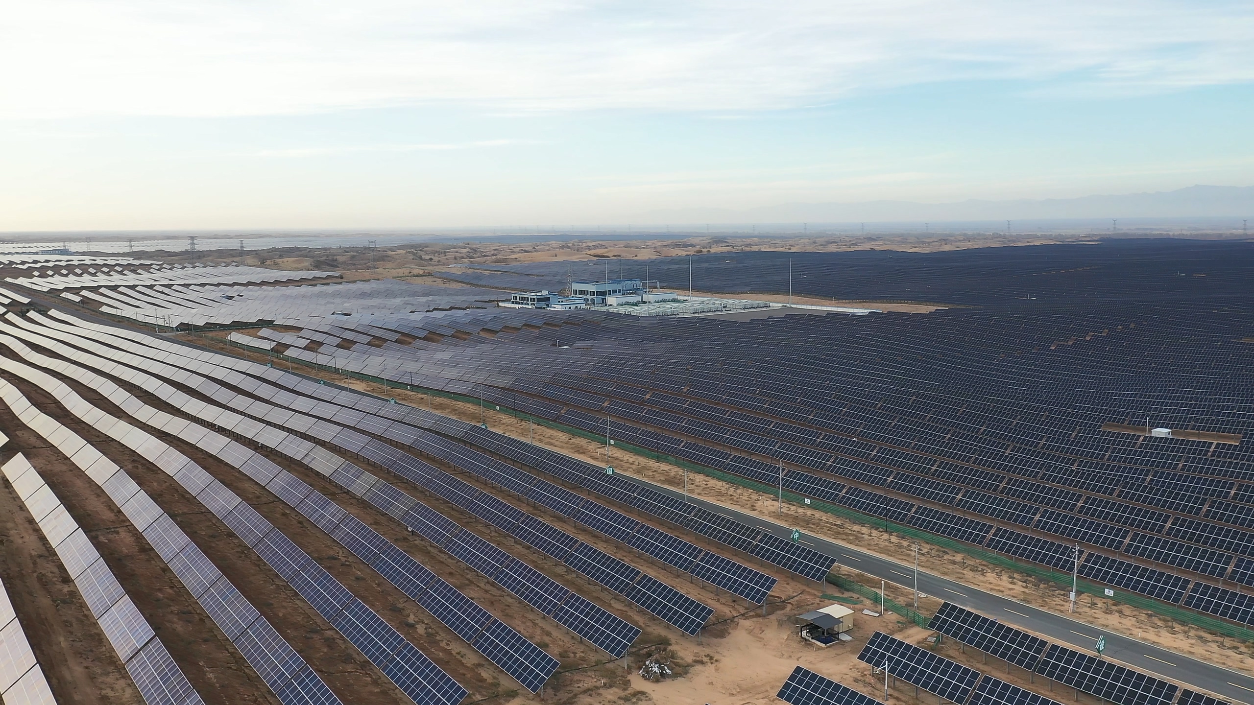 走近全球首个千万千瓦级新能源基地——内蒙古库布齐沙漠鄂尔多斯中北部新能源基地,百万块湛蓝色的光伏板阵列在金色沙海中绵延起伏,宛如一片"蓝色海洋"。