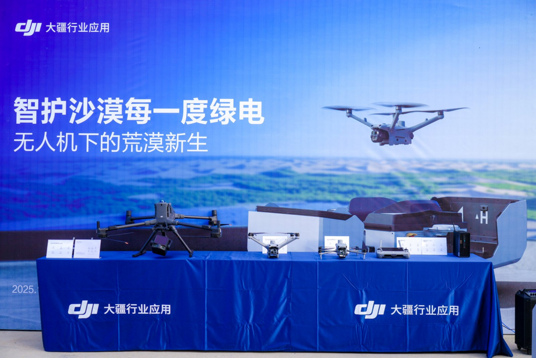 近日,大疆行业应用在内蒙古鄂尔多斯市达拉特旗库布齐沙漠举办“智护每一度绿电”的分享活动,集中展示其行业无人机技术在新能源基地建设和生态治理中的创新应用。