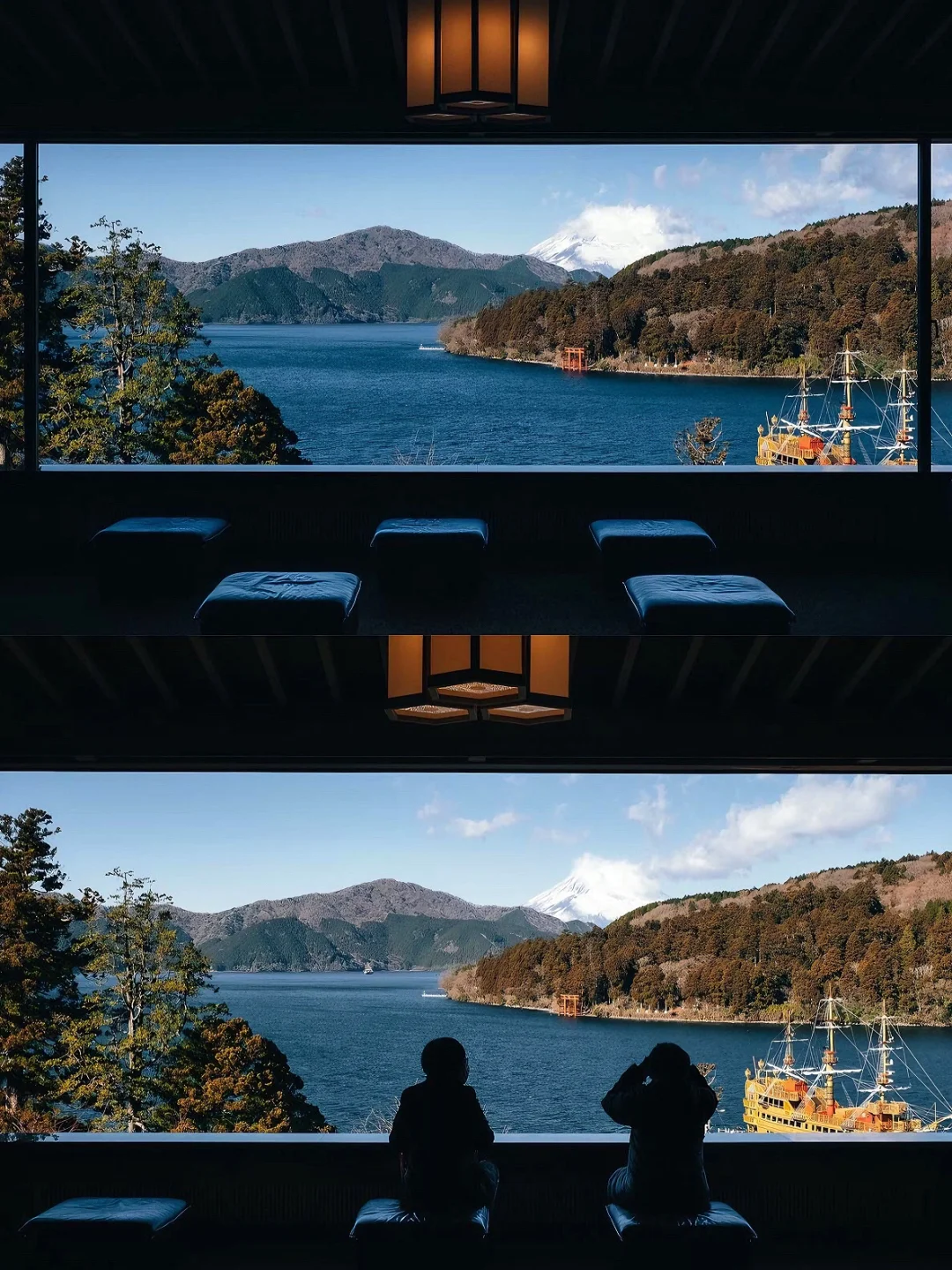 🔹馆内设有庭园、咖啡厅,可以一边品尝下午茶,一边欣赏芦之湖的全景、富士山、箱根群山美景,在玻璃窗框的衬托下,随着四季的不同,可以欣赏到不同面貌的景色