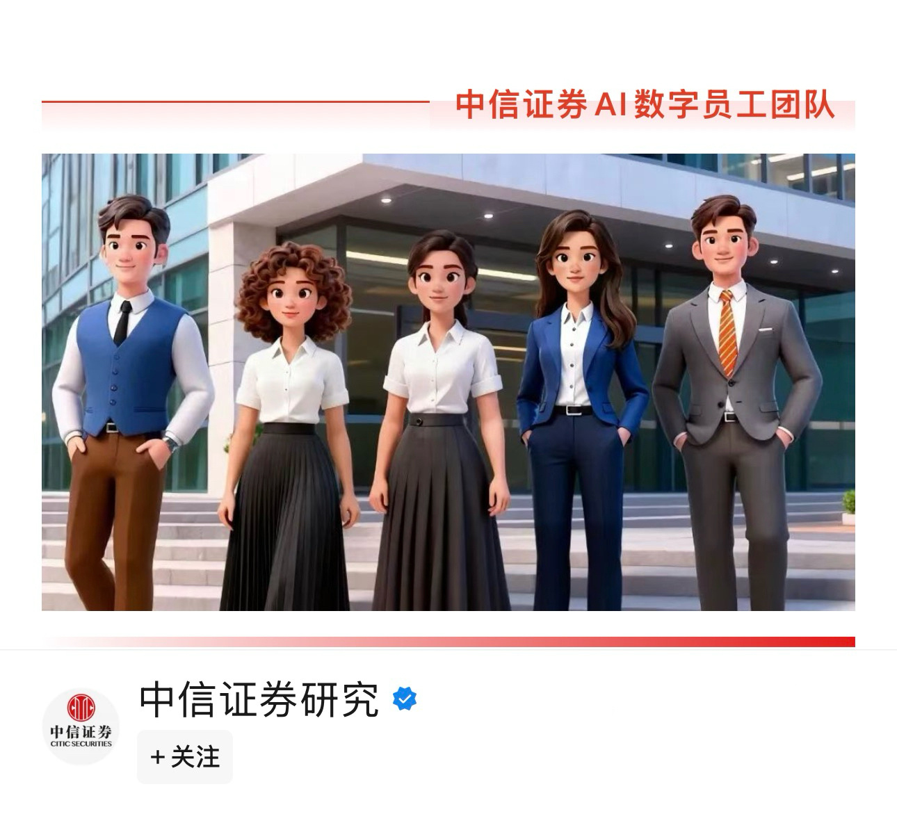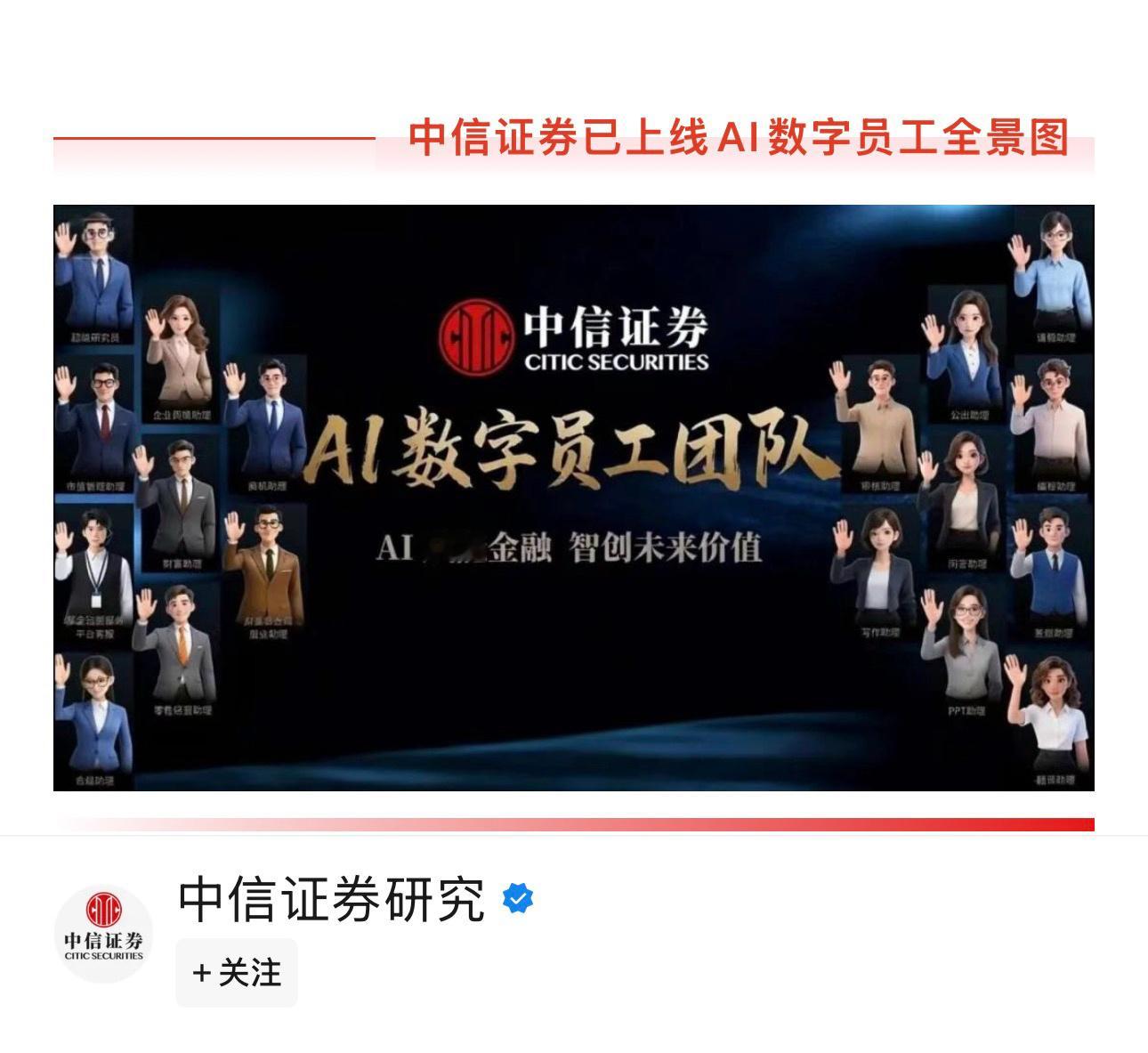 【中信证券来了18位新员工!称作“AI数字员工团队”】 (财联社 2025-11-12 18:43 ) 『 要点:① 中信证券2026年资本市场年会上,首席信息官、信息技术中心行政负责人于新利带来了数字员工上线的重磅信息; ② 中信证券现已上线18个数字员工,超级研究员、超级投行家、市值管理助理等成为大看点; ③ 数字员工旨在最终实现一岗一数字员工、一人一数字团队的人机协同新范式。 』 财联社11月12日讯 中信证券2026年资本市场年会上,数字员工上线的消息发布,一时间成为市场走势研判以外的最重要关注点。中信证券首席信息官、信息技术中心行政负责人于新利进行了“中信证券AI数字员工”主题演讲。 “中信证券当前已上线18位数字员工,今后,每位真实员工展业,背后都将有无形的数字员工助力,带领一群数字员工,相当于每位员工都升级为团队长。”于新利以这一模拟景象为开场,介绍了数字员工对正式员工的分身与赋能。 “我们的目标是打造智能化、拟人化、高效协同的数字员工体系,为每位员工配备多个‘数字分身’,最终实现‘一岗一数字员工、一人一数字团队’的人机协同新范式。”于新利介绍。 “数字员工必将重塑金融业态。”于新利首先对“数字员工”进行拆解与诠释。 “数字”代表数字化内核,“员工”则直指人工智能的赋能属性,将数字员工作为金融领域的核心应用载体,正是中信证券的重要战略选择。对真实员工将带来冲击吗?从记者访谈来看,那些交流能力更强、打交道特别强的真实员工,会更被强需求。 于新利以机器人来类比,好比手握一块屏幕,就能操控一群机器人、机器狗或无人机协同作战,战斗力堪比一个完整团队。 类似人机协同,每一位真实员工背后,都将依托一支无形的数字员工团队,这其中,基础工作由AI数字员工承接,真实员工则可专注于客户需求挖掘、反馈沟通与调研分析,推动人效的大幅提升。 团队依托AI与全链路数据整合能力,构建从管理到业务的数字员工体系。从业务方面,包括超级研究员、超级投行家、市值管理助理等典型数字员工;从管理方面,则包括请假助理、公出助理、翻译助理、PPT助理等多重功能数字员工。 金融行业正迈入数字化与智能化叠加的关键发展阶段,人才定义正被AI技术革新。在此背景下,中信证券正在积极探索数字员工的“三次进化”: • 一是从“执行者”到“思考者”,从被动执行任务到主动提供服务; • 二是从“单感官”到“多感官”,通过多模态的分析能力实现主动风险防范; • 三从“系统工具”到“工作伙伴”,数字员工与人类员工形成互补型协同,释放人类潜能。 于新利特别强调,构建高效、可信的数字员工队伍,必须聚焦数据治理、算法可信、技术自主三大核心支柱。中信证券将持续夯实数据基础,构建“可靠、安全、可解释、可问责”的大模型能力,打造自主可控的金融AI底座,为业务创新与高质量发展提供坚实支撑。 [ 18位数字员工已上线 ] 记者了解来看,不到一年多的时间,中信证券对所有业务线、所有岗位的流程、内涵与需求全面梳理,再对此进行封装,成为了数字员工的需求底座。24小时不休息的数字员工,可以对应与满足真实员工的工作需求。 在于新利看来,很多真实员工的工作内容都可以封装到数字员工。以市值管理例,只要给数字员工输入“给我做某家公司的市值管理方案”的指令,相关方案便可在一分钟内完成。数字员工市值管理能力的核心,正是由资深经营者结合业务现状设计,将过往工作经验、专业能力注入市值管理能力体系,数字员工可随时响应真实员工的业务诉求。 截至目前,中信证券已有18个高价值数字员工成功上线,年底还有28个项目处于开发阶段。于新利强调,未来每一位员工都将成为数据学习的载体,不再依赖有限的人工培训,新入职员工可以直接承接中信多年积累沉淀的业务能力,能快速上手各类业务。当然,这也对新入职员工的素质提出了更高要求。 “该体系将顶尖业务专家的经验沉淀为标准化智能工具,赋能一线人员,让优质金融服务更广泛、更高效地触达客户。”于新利介绍了数字员工体系的实现目标。 [ 数字员工到底行不行? ] 中信证券的数字员工划分为管理类与业务类两大类。管理类数字员工聚焦实际运营场景,复刻优秀员工的专业流程;业务类数字员工则具备跨业务线协同能力。当客户提出需求(如发送相关文件)时,数字员工可作为总协调方,联动政策、企业客户等相关环节,全程提供操作支撑。 比如公出助理类的数字员工,帮助员工在差旅管理上减少大量时间的耗费,真实员工只需简单告知何时何地出行,何种出行方式等,系统就能自动生成完整的解决方案并在流程中同步提交,报销流程也是如此。 在业务赋能方面,于新利重点介绍了超级研究员:超级研究员深度融合了大模型与智能体技术,聚合内外部多领域研究成果,具备自动化数据加工、多模态输出、个人知识库等能力。用户仅需提出研究分析需求,便可自动生成包括图表在内的数万字深度研报。 “可在几分钟内完成八九万字的趋势报告,专业水准可媲美3年以上工龄的研究员。”于新利的这样一个简单描绘,生动刻画了超级研究员的超级能力。 另一重点开发项目是“超级投行家”。该项目通过整合投行业务的市场全数据、公司全数据等,构建私域服务型数据库,让投行人员无