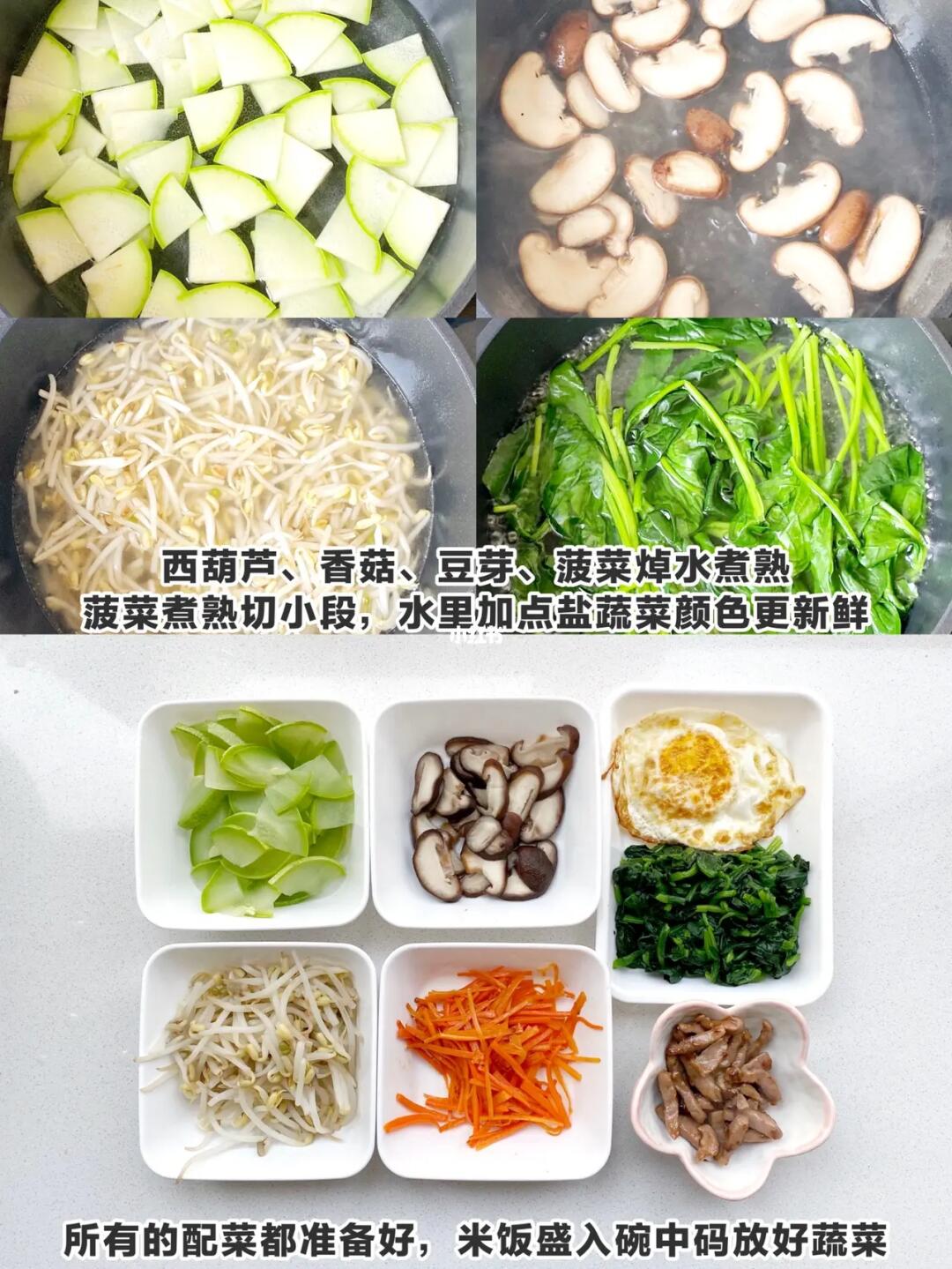 3⃣️其余蔬菜焯水煮熟,所有的食材码放在米饭上。