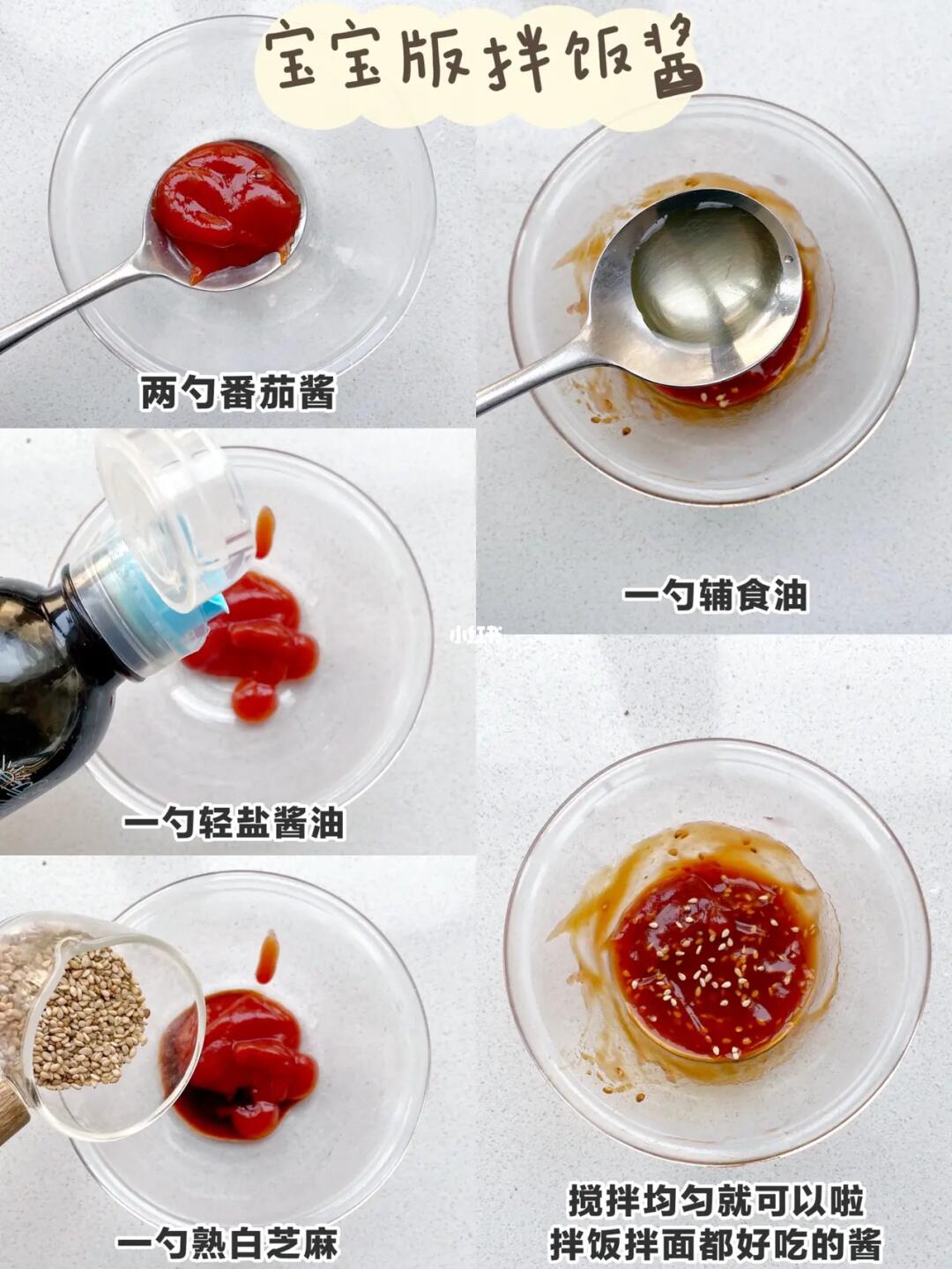 🌟宝宝版拌饭酱:2勺番茄酱+1勺轻盐酱油+1勺辅食油(建议核桃油)+1勺白芝麻