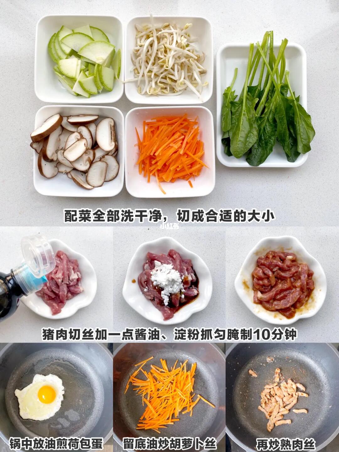 鸡蛋、菠菜、胡萝卜、香菇、猪梅花肉、胡萝卜、豆芽、米饭、轻盐酱油