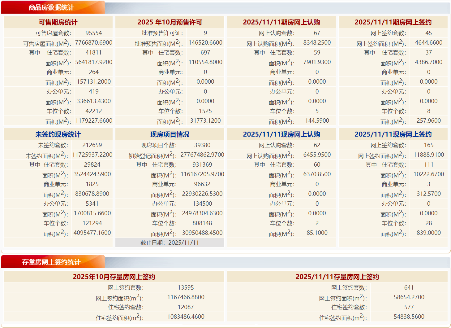 根据北京市住房和城乡建设委员会数据:11月11日,北京新房住宅网签148套,网签面积约14,609.37㎡;二手房住宅网签577套,网签面积约54838.56㎡。