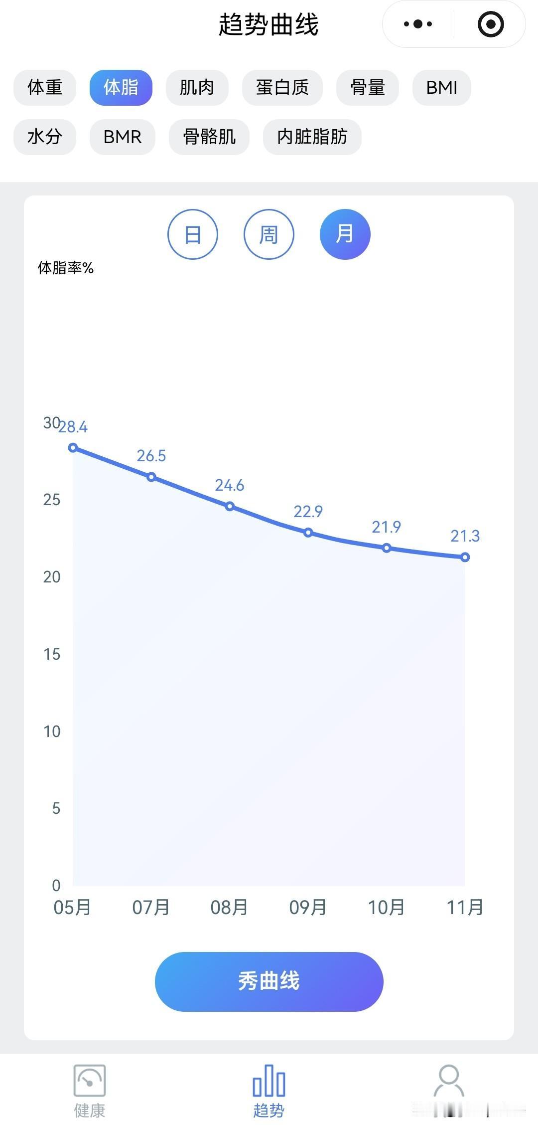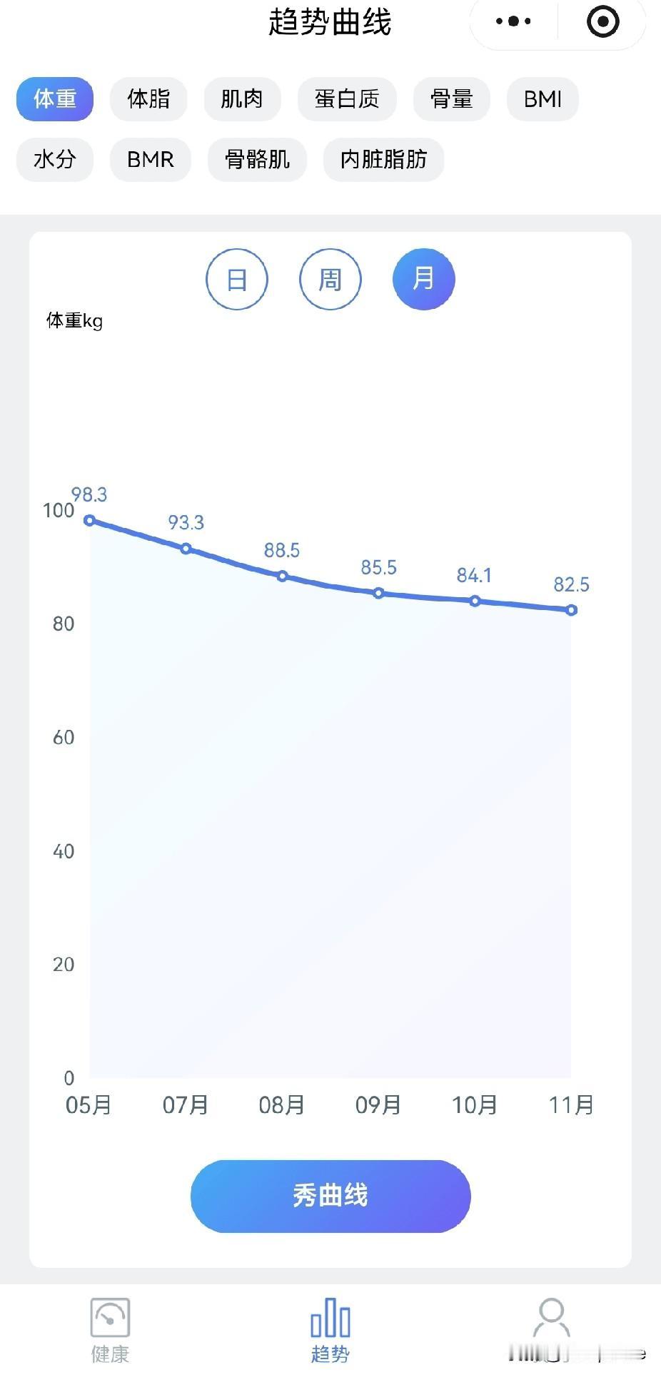 因为工作原因,需要长期应酬,三年左右吃胖了差不多50斤,我想改变现状,于是7月份辞职出来,开始运动+饮食控制,7-8月份开始跑步的时候,跑一公里都气喘吁吁,每天只能运动个几分钟,但既然开始了这条路,我就一定咬牙坚持! 饮食也渐渐清淡,大多数时候只吃一餐,刚开始体重会下降很快,但后来的效率开始降低,偶尔还会和朋友喝点小酒,反弹也是非常迅猛!但几乎养成了天天运动的习惯! 就这样,我两个月从197斤减肥到了175左右,跑完3-5公里也不会那么大喘气了,于是我果断报名了11月底的马拉松赛事,想在逼自己一把,毕竟我的目标是减掉40斤,在日复一日的坚持下,体重依旧缓慢下降,到今天自己来到了164斤,距离目标8斤,10公里也跑进了一个小时! 渐渐的,我已经爱上了跑步,并保持了每天运动的习惯,跑累了就带着个篮球与小伙伴在篮球场上并肩作战,这个月还有最后17天,不管是减肥成功还是半马的比赛我都充满自信,我只是个普通人,但希望我的经历也同样能激励处于低谷中的你,加油吧,每天再进步一点点!减肥 减肥感受心得 日常化减肥记录