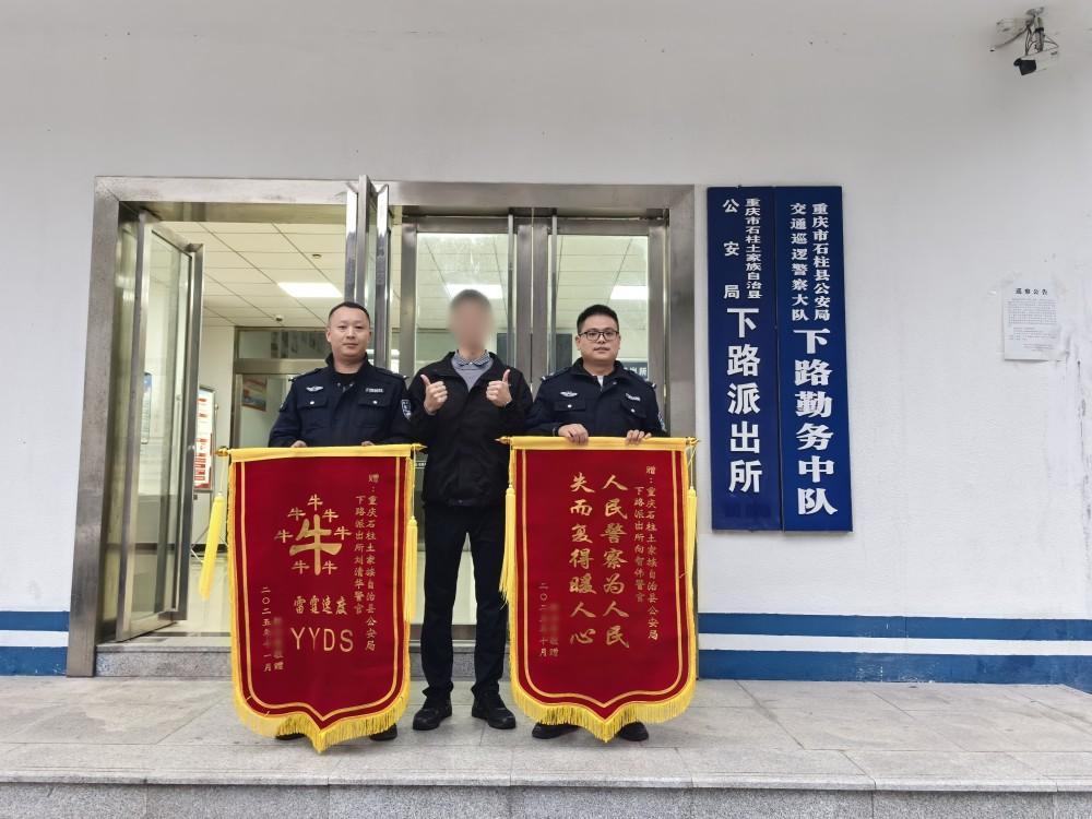 11月7日,郎某专程来到重庆市石柱县公安局下路派出所,将两面印有“雷霆速度YYDS”“人民警察为人民失而复得暖人心”的锦旗送到民警手中,对民警热心、高效的工作表达诚挚的谢意。