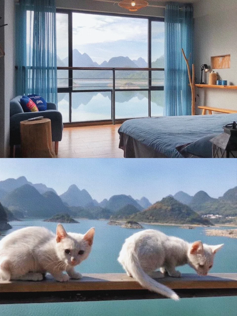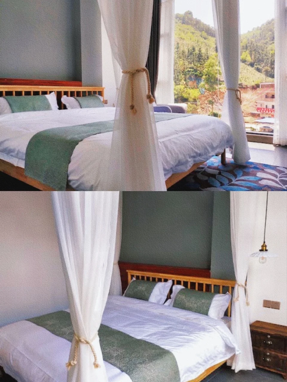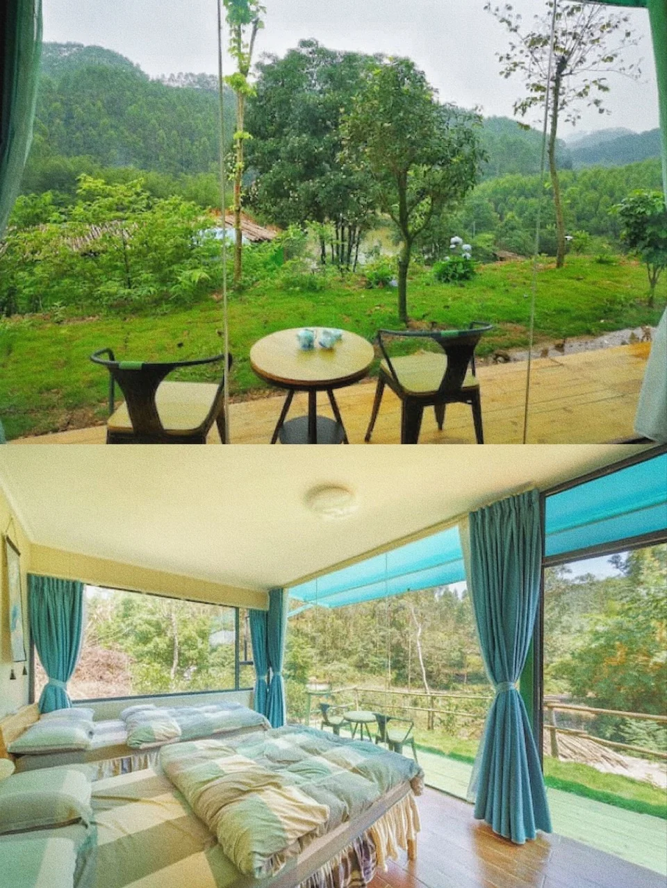 透过房间的落地窗就能看见远处的山景,房源的布道往下走有个很大的泳池,很喜欢