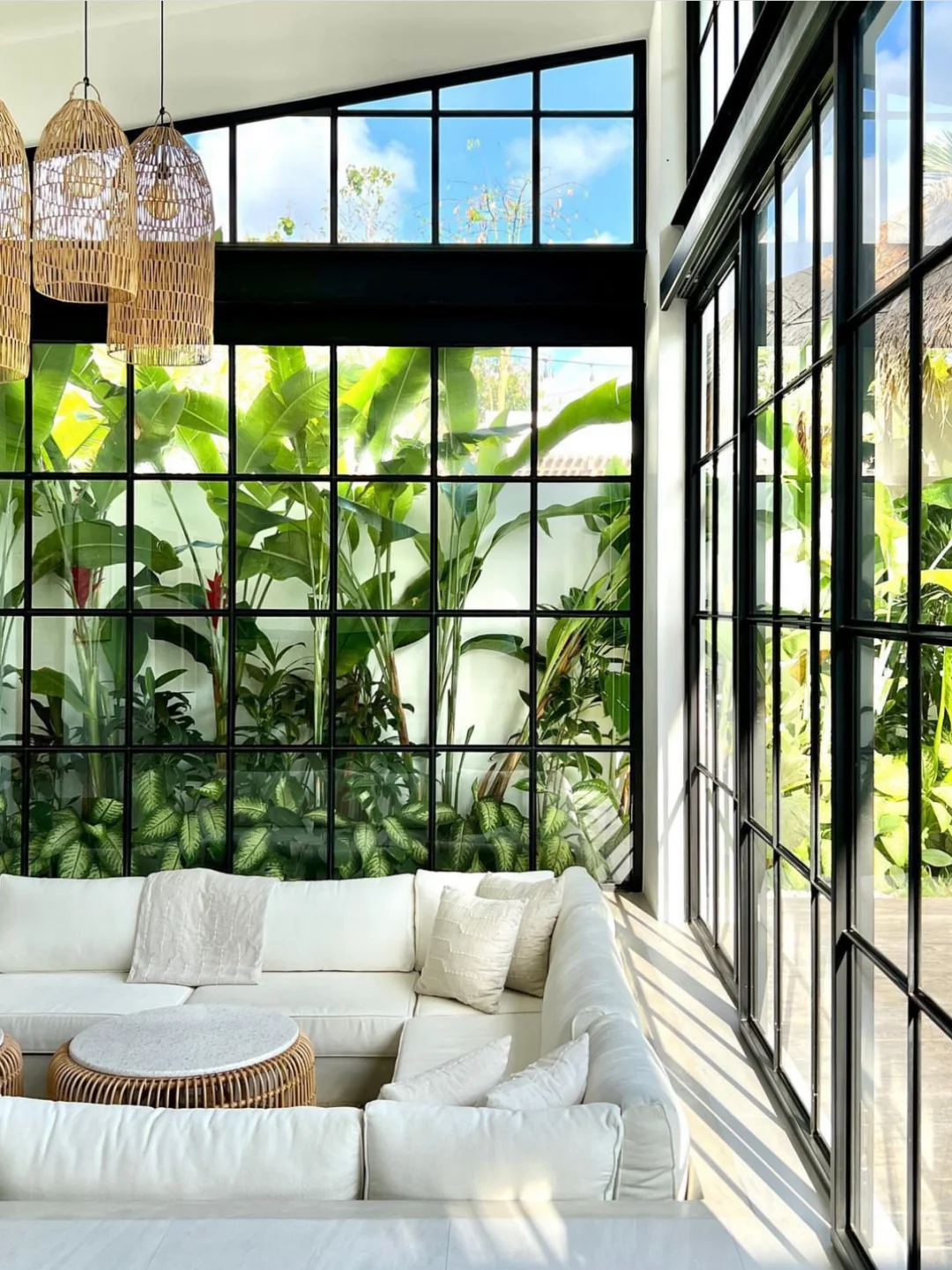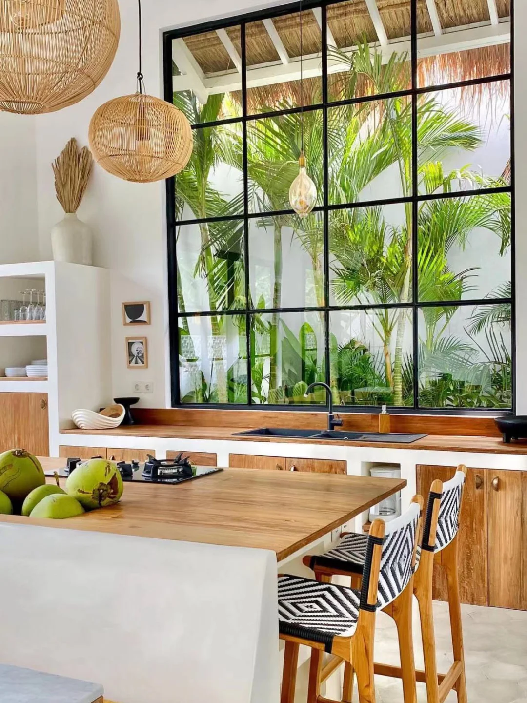 ▪️ 太喜欢落地窗了,黑框滑动玻璃门可欣赏热带香蕉种植园的美景, 可以打开门凉爽的海风,或者关上门在带空调的厨房和客厅里放松身心