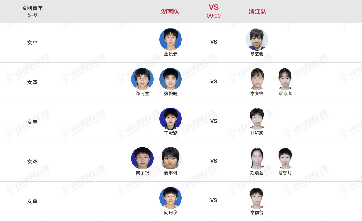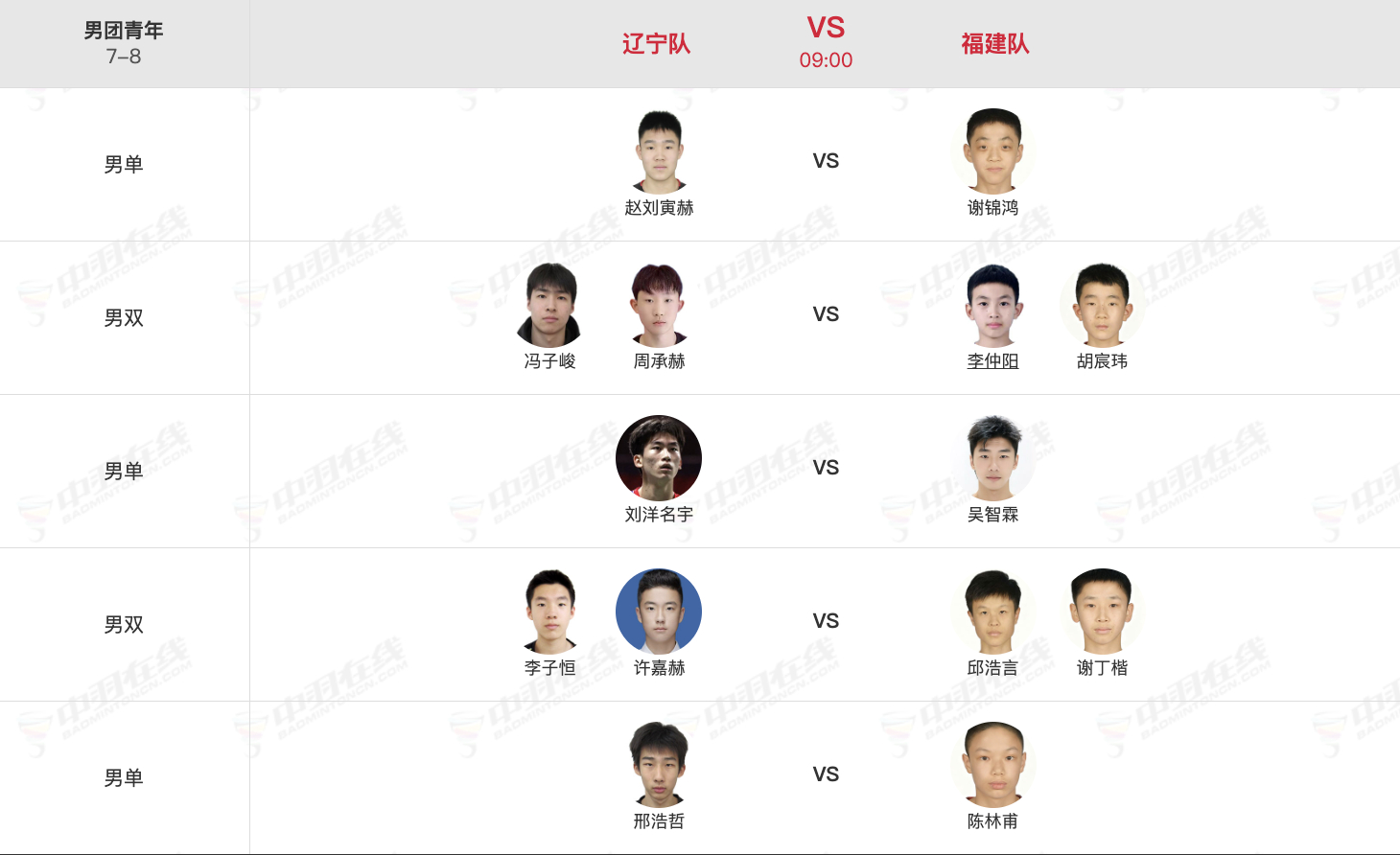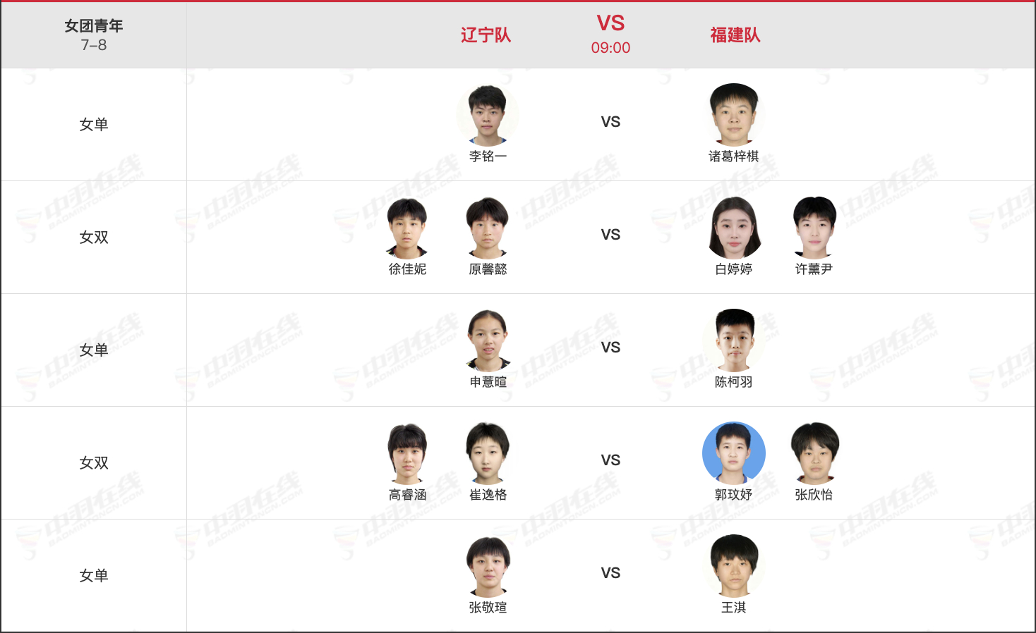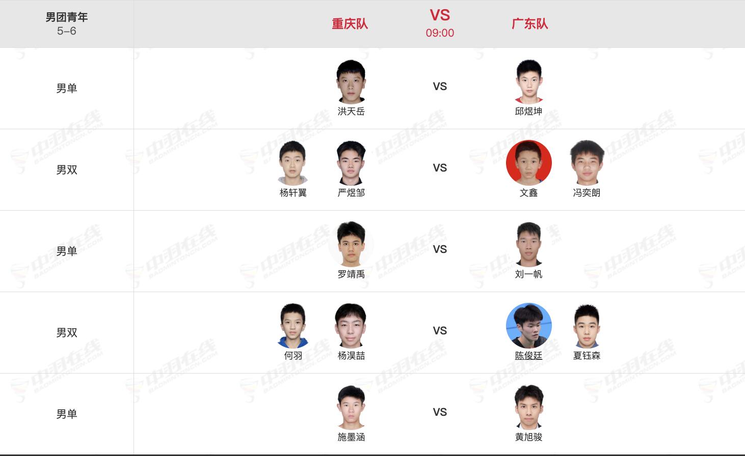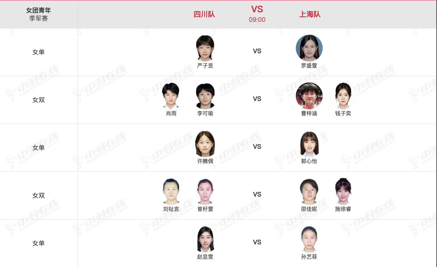 全运会羽毛球赛团体赛11月13日青年组决赛及排位赛,早上9点开赛: