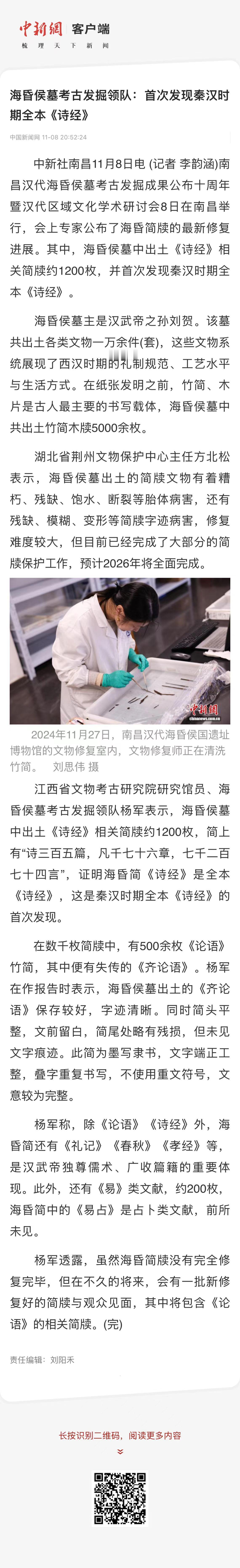 【海昏侯墓考古发掘领队:首次发现秦汉时期全本《诗经》】  (中国新闻网 2025-11-08 20:52:24 )   中新社南昌11月8日电  南昌汉代海昏侯墓考古发掘成果公布十周年暨汉代区域文化学术研讨会8日在南昌举行,会上专家公布了海昏简牍的最新修复进展。其中,海昏侯墓中出土《诗经》相关简牍约1200枚,并首次发现秦汉时期全本《诗经》。  海昏侯墓主是汉武帝之孙刘贺。该墓共出土各类文物一万余件(套),这些文物系统展现了西汉时期的礼制规范、工艺水平与生活方式。在纸张发明之前,竹简、木片是古人最主要的书写载体,海昏侯墓中共出土竹简木牍5000余枚。  湖北省荆州文物保护中心主任方北松表示,海昏侯墓出土的简牍文物有着糟朽、残缺、饱水、断裂等胎体病害,还有残缺、模糊、变形等简牍字迹病害,修复难度较大,但目前已经完成了大部分的简牍保护工作,预计2026年将全面完成。  江西省文物考古研究院研究馆员、海昏侯墓考古发掘领队杨军表示,海昏侯墓中出土《诗经》相关简牍约1200枚,简上有“诗三百五篇,凡千七十六章,七千二百七十四言”,证明海昏简《诗经》是全本《诗经》,这是秦汉时期全本《诗经》的首次发现。  在数千枚简牍中,有500余枚《论语》竹简,其中便有失传的《齐论语》。杨军在作报告时表示,海昏侯墓出土的《齐论语》保存较好,字迹清晰。同时简头平整,文前留白,简尾处略有残损,但未见文字痕迹。此简为墨写隶书,文字端正工整,叠字重复书写,不使用重文符号,文意较为完整。  杨军称,除《论语》《诗经》外,海昏简还有《礼记》《春秋》《孝经》等,是汉武帝独尊儒术、广收篇籍的重要体现。此外,还有《易》类文献,约200枚,海昏简中的《易占》是占卜类文献,前所未见。  杨军透露,虽然海昏简牍没有完全修复完毕,但在不久的将来,会有一批新修复好的简牍与观众见面,其中将包含《论语》的相关简牍。