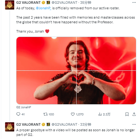 虎扑11月13日讯G2发文表示JonahP已从首发名单移除,其正式离队后才发告别视频