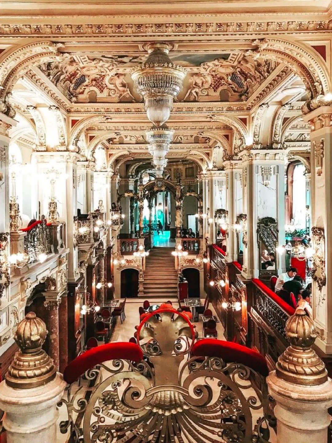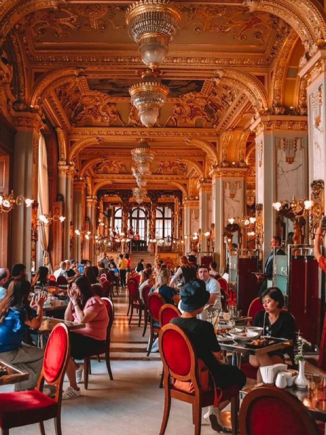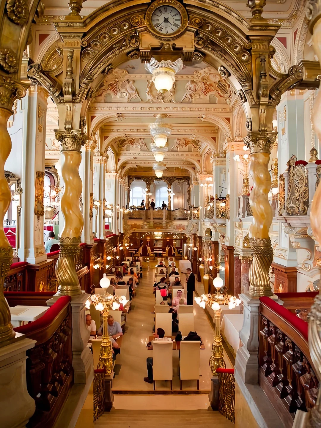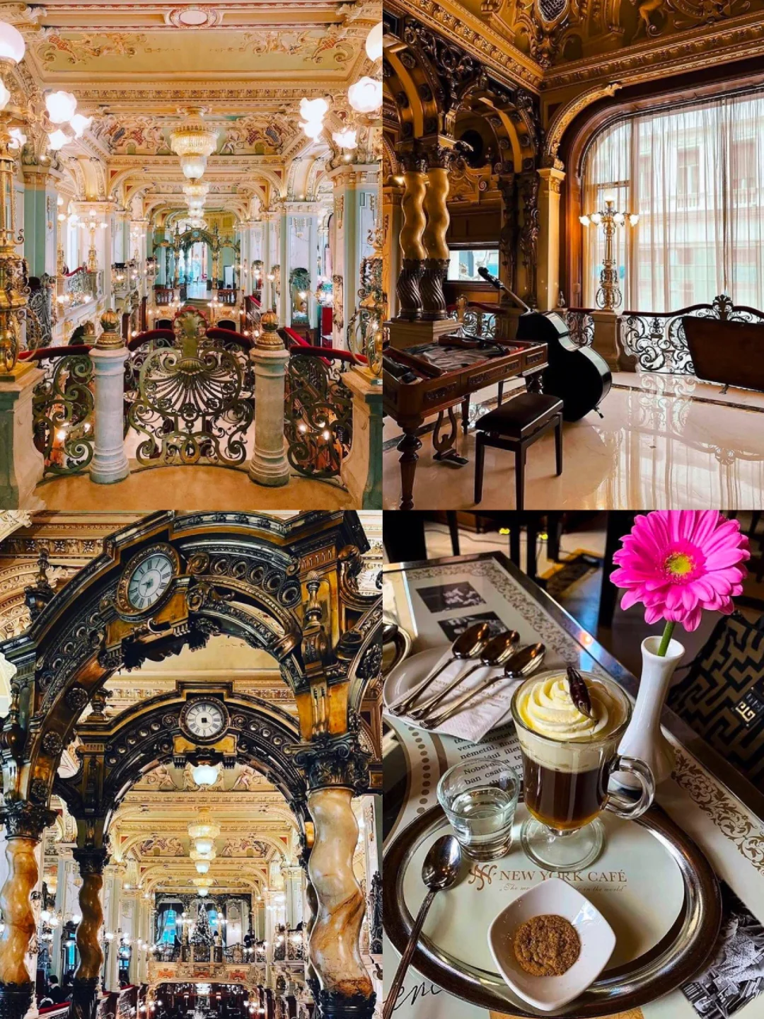 之前做布达佩斯攻略的时候就被这个装饰的富丽堂皇的咖啡店所吸引住了,这家有着百年历史的老店叫做纽约咖啡馆,坐落于一座19世纪的建筑内,上下三层上百米的大厅,金碧而辉煌,到处是雅致而气派的大理石柱子,天花全以金漆浮雕、彩绘壁画和水晶灯装饰,货真价实的复古家具,融合意大利文艺复兴和巴洛克式装潢诉说着当年的繁荣奢华!