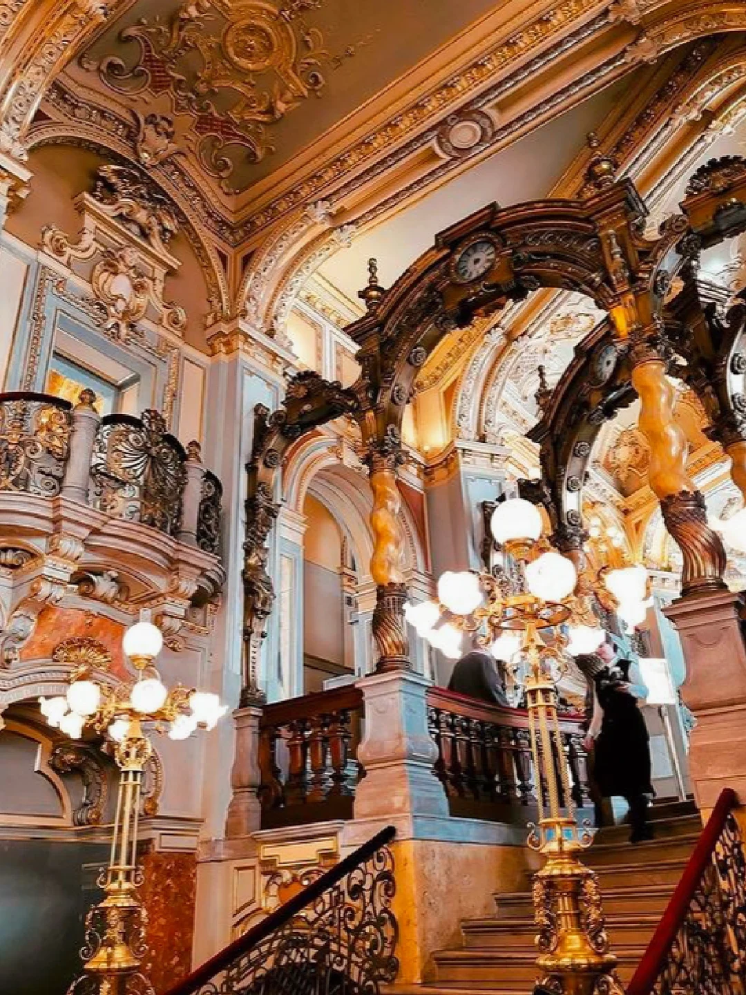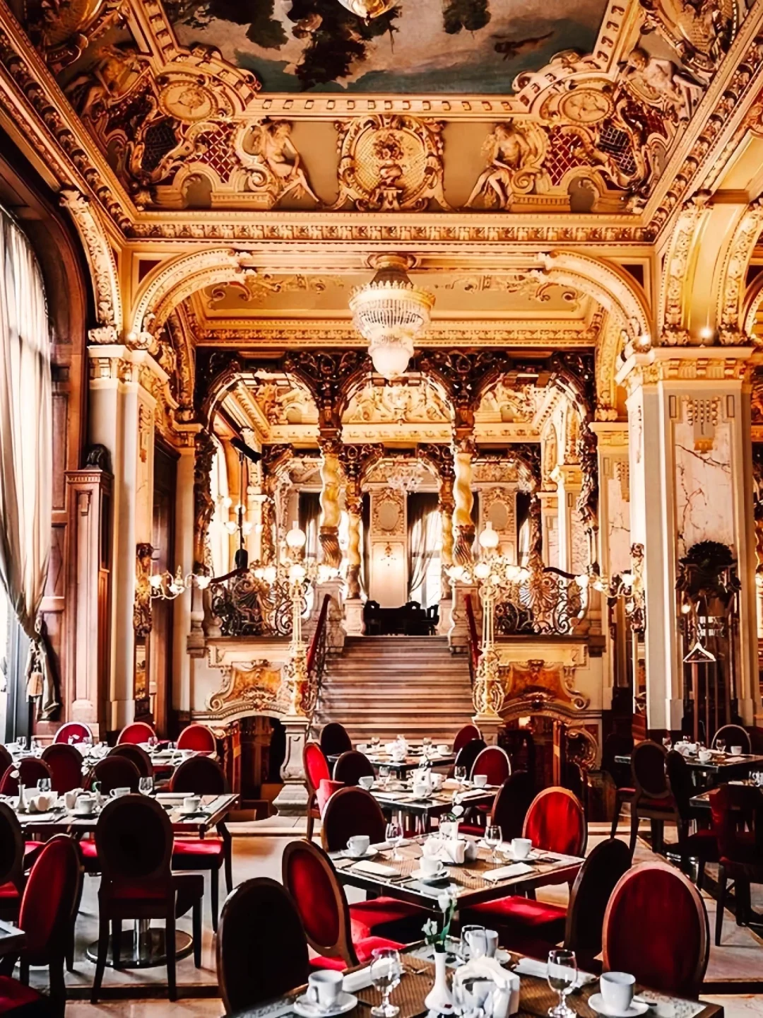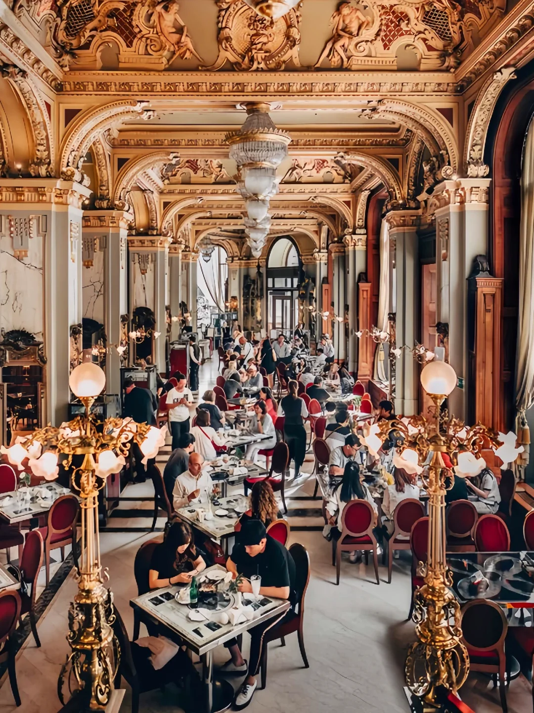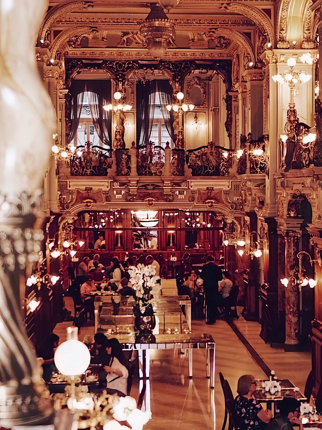 之前做布达佩斯攻略的时候就被这个装饰的富丽堂皇的咖啡店所吸引住了,这家有着百年历史的老店叫做纽约咖啡馆,坐落于一座19世纪的建筑内,上下三层上百米的大厅,金碧而辉煌,到处是雅致而气派的大理石柱子,天花全以金漆浮雕、彩绘壁画和水晶灯装饰,货真价实的复古家具,融合意大利文艺复兴和巴洛克式装潢诉说着当年的繁荣奢华!