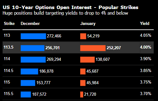 过去一周,看涨期权的未平仓量迅速上升,显示交易员正加码押注美债上涨。这些交易主要集中在12月和1月到期的期权,分别于11月21日和12月26日到期。