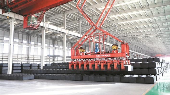 在阿拉尔市南疆碳素新材料有限公司,工人操作天车码放预焙阳极生料块(资料图片)。近年来,一师阿拉尔市因地制宜建设现代化产业体系,做强做大做优实体经济,加快形成新质生产力。目前,该师市拥有高新技术企业28家、科技型中小企业23家、科学研究与开发机构15个,涉及制造业、新能源、新材料、农业生物技术应用等领域。兵团日报常驻记者林国强摄