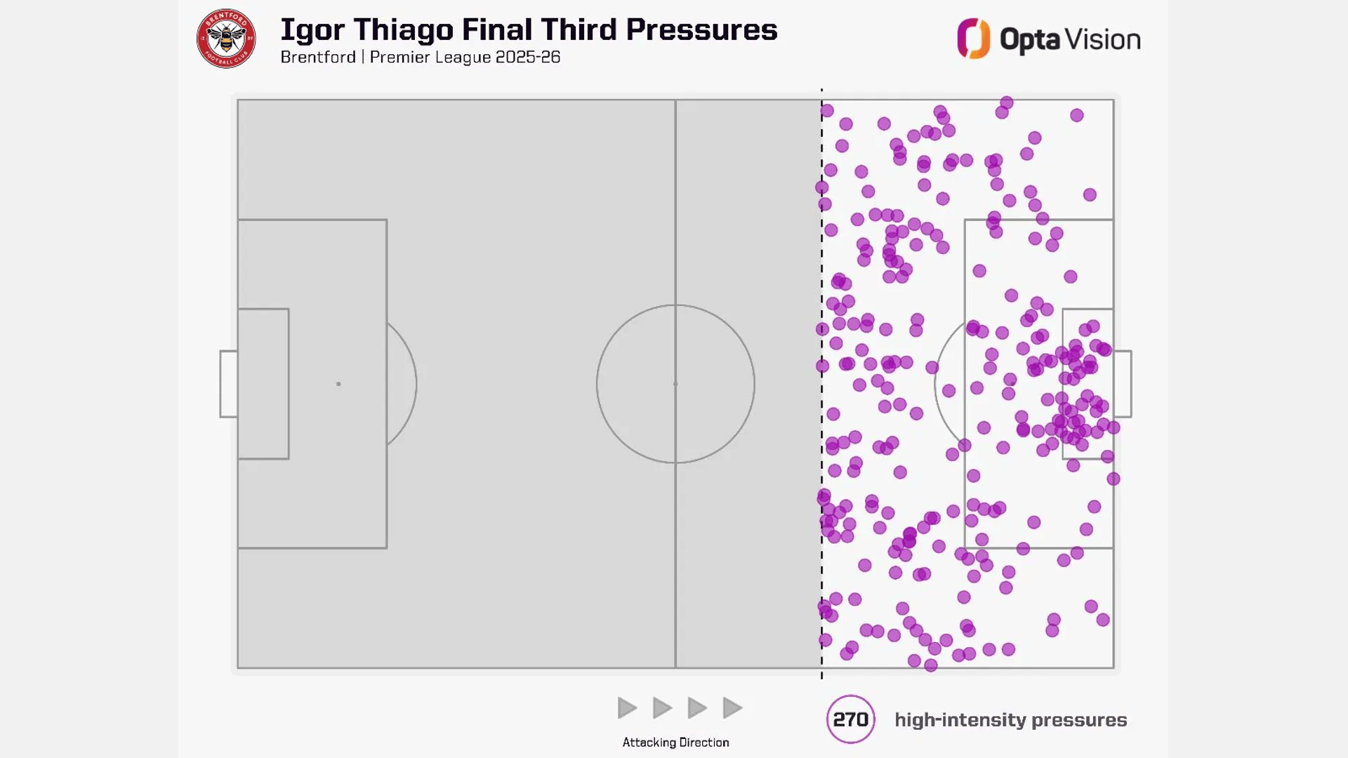 更重要的是,在前场三区的高压逼抢统计中,蒂亚戈也以270次高居榜首,充分体现了他在布伦特福德体系中的关键作用。