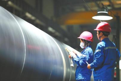 资阳石油钢管有限公司车间里,工人在进行螺旋管产品防腐前管端处理。张川摄