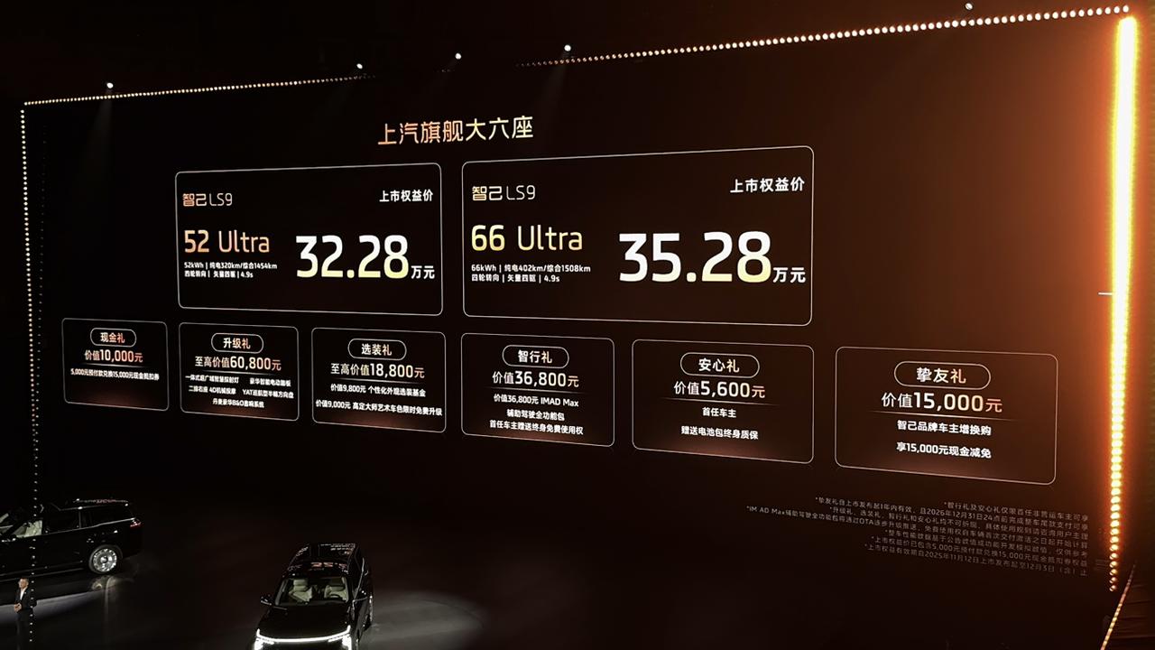 智己LS9只有两个版本 区分52度和66度电池组 定价分别是32.28万、35.28万 除了电池差距,高配还有四电门 其余配置部分没区别 让你完全没有选择困难,我建议52 在高科技部分,灵犀数字底盘3.0、恒星超级增程、520线激光雷达、150mm双腔空悬、后轮双向24度转向等,这些都是标配。 在舒适配置方面,主驾机械按摩、二排4K娱乐屏、副驾3K娱乐屏、全车零重力座椅、冷暖冰箱等,也是标配的。 你觉得还不够的话!B&O音响、二排右座机械按摩、智慧探射灯、电动踏板、半幅方向盘、高定艺术车漆,这些都是限时免费升级! 作为智己的旗舰,它真的拿出上汽集团所有高端技术去支持自家产品。这辆LS9好有诚意,关键是价钱不离地。【来自懂车帝车友圈】