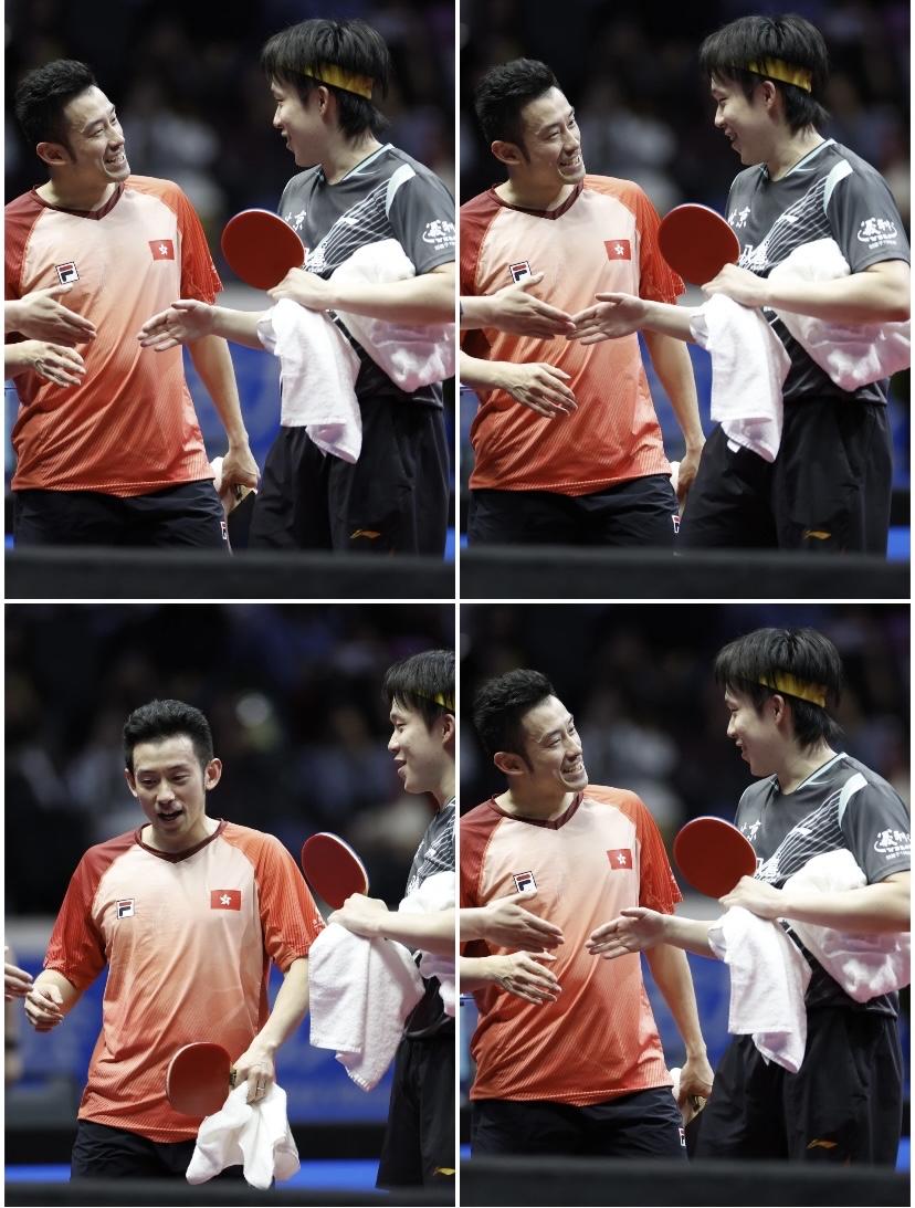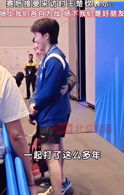 大圣轻揽王楚钦的腰去采访,他大笑说和王楚钦擦出火花,但被摁灭, 王楚钦说两个人私