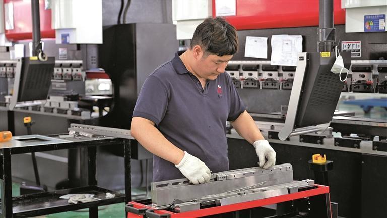 11月10日,永寿县鑫悦昇机械制造科技有限公司钣金制造车间内,折弯工人徐克俊在自检折弯成品。通讯员马坤摄