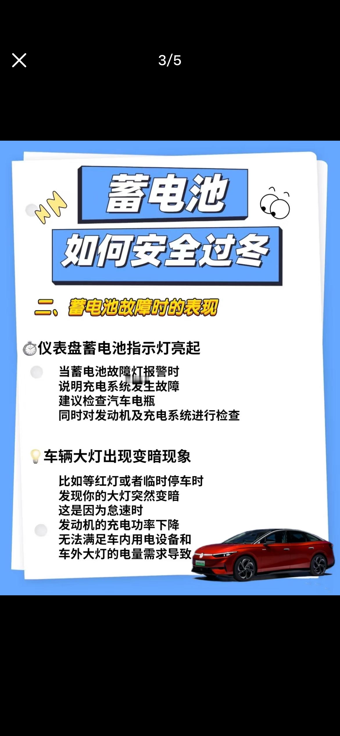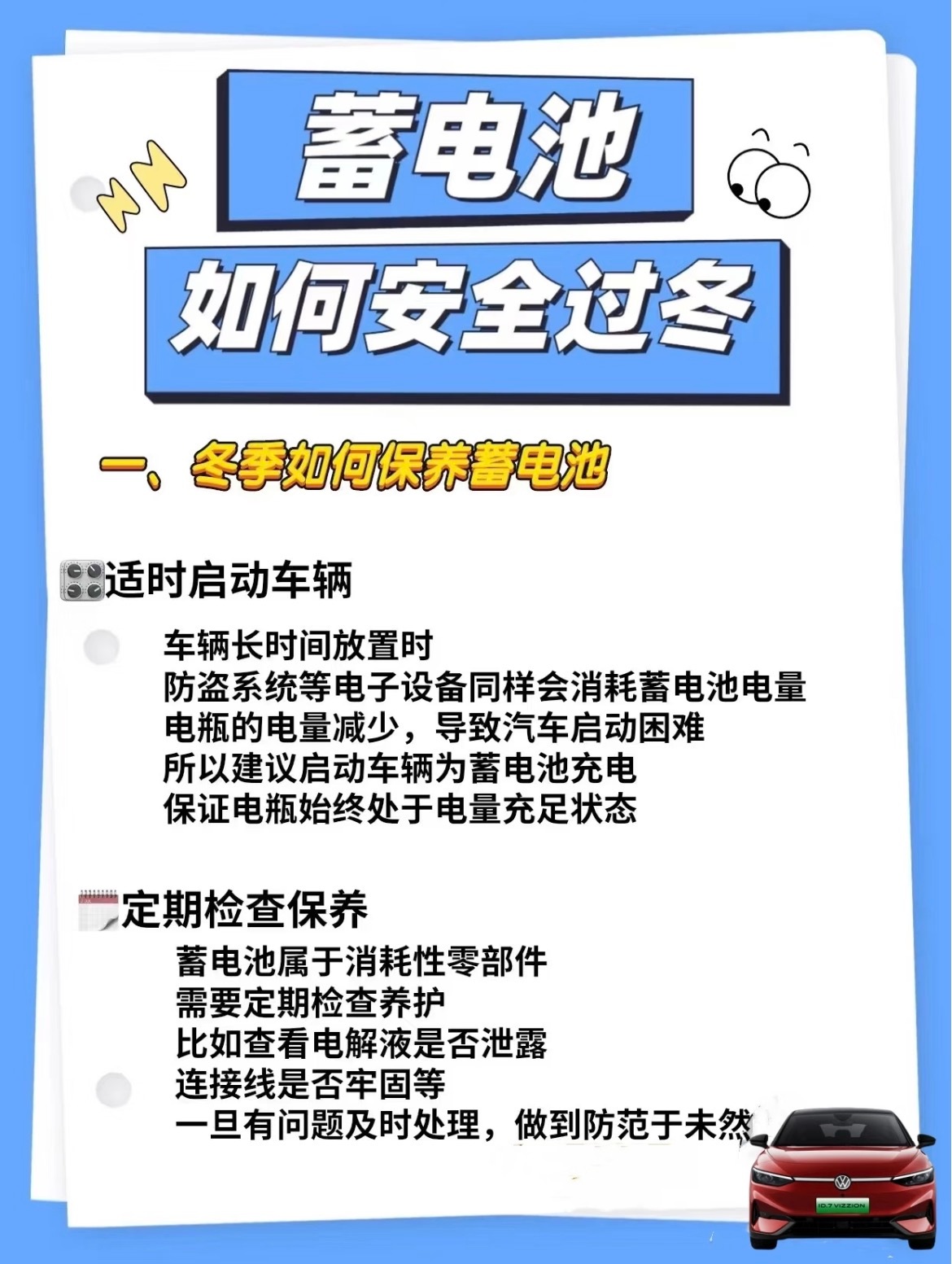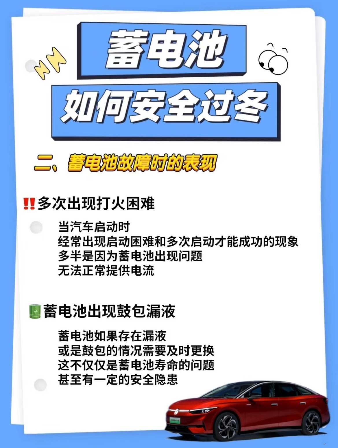 蓄电池安全过冬秘籍来啦!记得点赞+收藏哦,关键时刻别找不到啦✨一. 冬季蓄电池保养大法🔋1⃣ 合理使用车上电器别让车载音响、空调、加热座椅这些“电老虎”过度消耗蓄电池能量哦!记得适时关闭,让它们也喘口气~2⃣ 勿频繁超短途行驶短途行驶蓄电池充不满电,长期下来可是会伤身的!尽量安排长途出行,让蓄电池充分充电,保持活力满满!3⃣ 适时启动车辆长时间停放记得定期启动车辆,给蓄电池“醒醒脑”,避免电量流失过多,变成“沉睡美人”💤4⃣ 定期检查保养别忘了给蓄电池做个全面体检,看看电极是否干净、连接是否牢固,这样才能确保它冬天也能杠杠滴!二. 蓄电池故障预警信号1⃣ 仪表盘蓄电池故障指示灯亮起看到这个小红灯亮起,千万别忽视,赶紧检查蓄电池状态!2⃣ 车辆大灯变暗大灯亮度不够,可能是蓄电池电量不足啦,赶紧处理,别让夜晚行车变“摸黑”!3⃣ 多次打火困难打火两三次才成功?蓄电池可能已经在喊“累”了,赶紧保养起来!4⃣ 蓄电池鼓包漏液这可是大忌!看到蓄电池鼓包或漏液,赶紧远离,别犹豫,直奔4S店!温馨小贴士蓄电池如果被冻住,千万别充电使用哦!否则可能会引发蓄电池爆炸,安全第一!建议直接前往4S店进行专业检查更换,让爱车安全过冬!