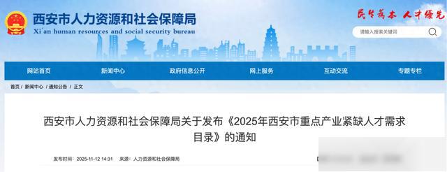 11月12日西安市人力资源和社会保障局网站发布《2025年西安市重点产业紧缺人才需求目录》具体内容如下↓↓↓