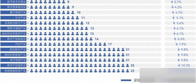 不同产业的紧缺岗位占比数据显示,高端装备制造产业与数字产品服务业的紧缺岗位占比最高,均为10.3%,是紧缺岗位最集中的两大产业;电子信息产业、航空航天产业及新材料新能源产业紧随其后,紧缺岗位占比均达9.8%;汽车产业(7.9%)、数字产品制造业(6.5%),以及食品和生物医药产业、氢能与储能产业(均为6.1%)的紧缺岗位占比也相对较高;未来航空航天产业(5.6%)、光子产业(5.1%)的紧缺岗位占比处于中间水平;量子信息产业(4.7%)、数字要素驱动业(4.2%)、数字技术应用业(3.7%)的紧缺岗位占比较低。