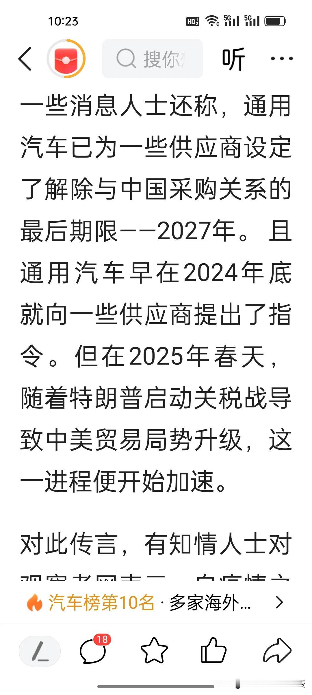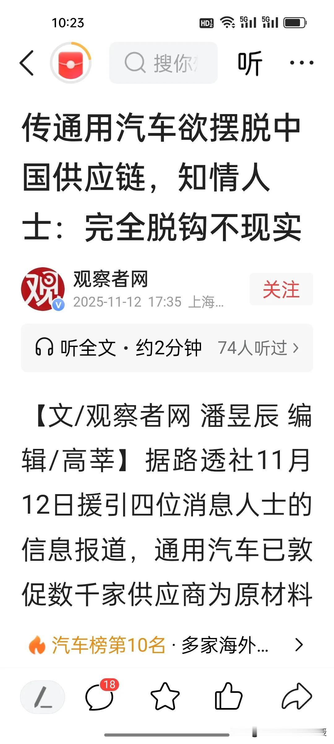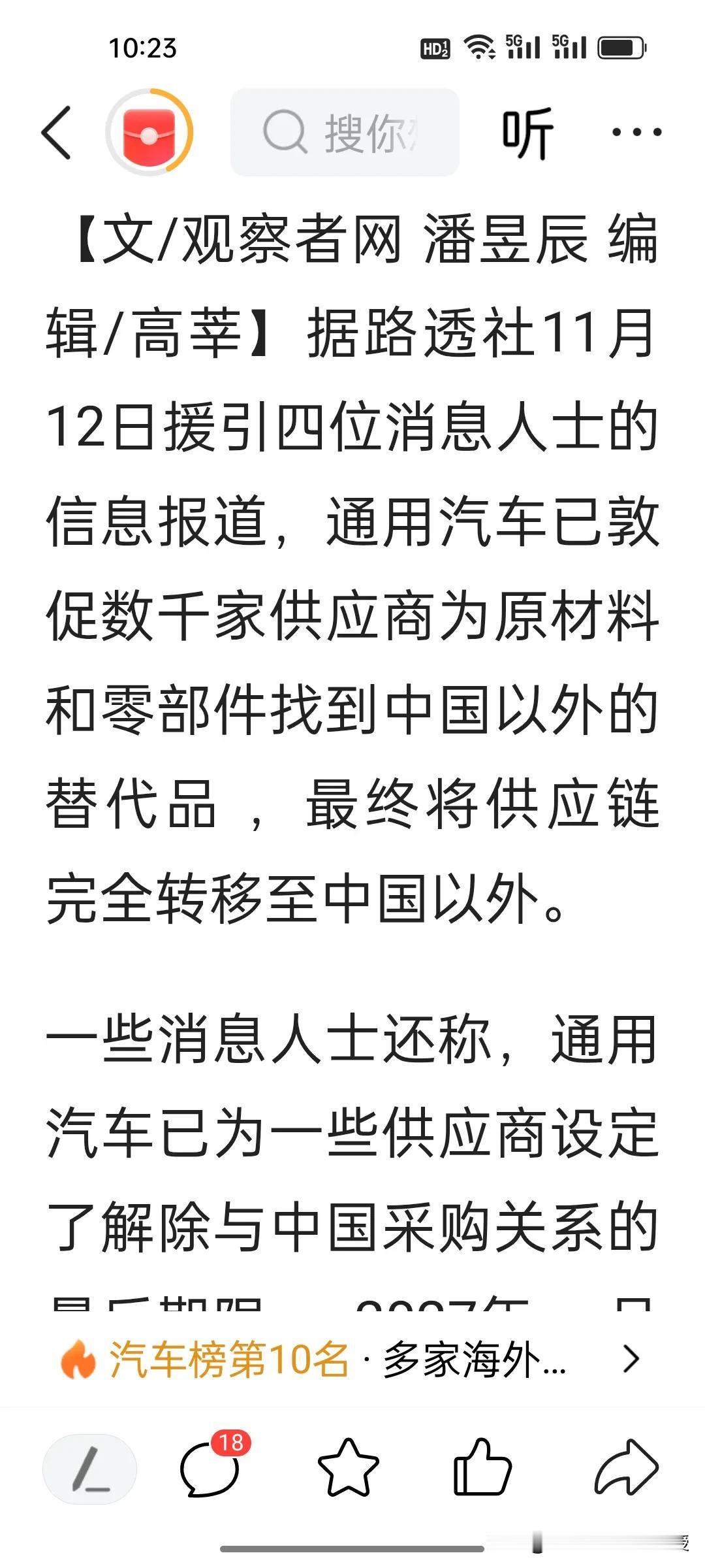 通用汽车这是未雨绸缪,自断臂膀?竟然想与中国供应链脱钩? 今年第三季度通用全球营收破1397亿,在华销量47万辆汽车,增长10.1%,2024年全球销量410万辆,排第六,中国市场撑起近三成份额,中国市场已经是通用不可或缺的全球主要市场。 根据《观察者网》报道,有关人士消息,通用汽车已经让数千家原料供应商要找中国以外的原材料替代品,要在2027年脱离中国供应链。 这简直是异想天开啊!车载电子、精密模具等核心部件,中国供应链的完整度、成本优势和技术成熟度,这是二三十年沉淀的硬实力,通用汽车还要上哪里去找性价比这么高的原材料替代呢?美国的汽车行业供应链重构,这是嘴上说说就能完成的吗? 没有中国供应链托底,通用在中国的销量和整体利润都得大幅下降,所谓“脱钩”不过是纸上谈兵,我不信通用汽车能真正做到完全脱钩。