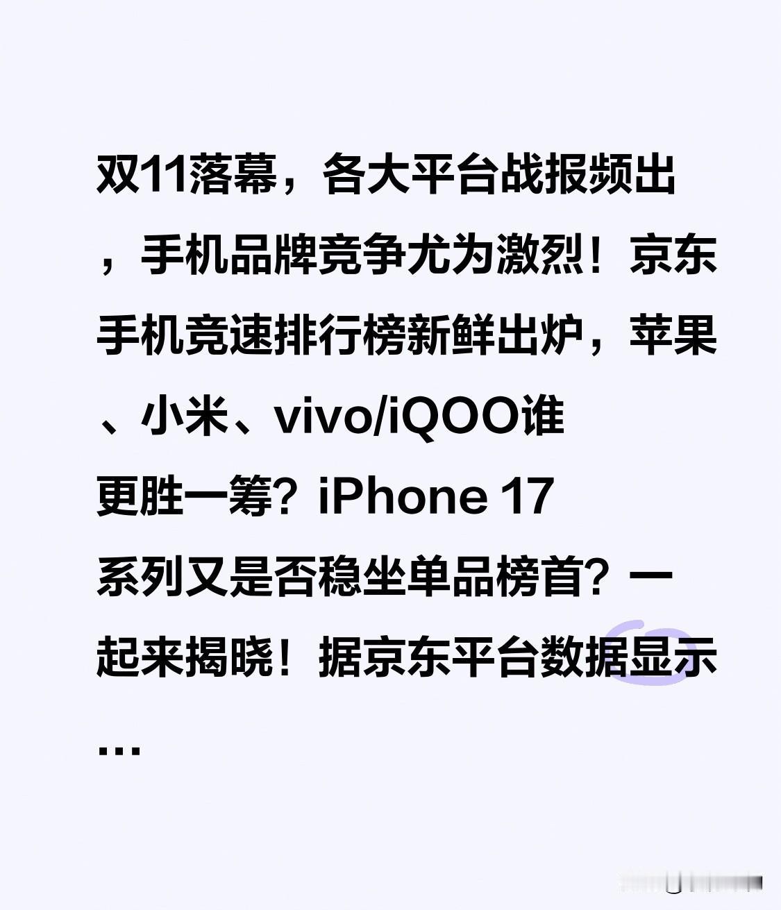 双11落幕,各大平台战报频出,手机品牌竞争尤为激烈!京东手机竞速排行榜新鲜出炉,苹果、小米、vivo/iQOO谁更胜一筹?iPhone 17系列又是否稳坐单品榜首?一起来揭晓! 据京东平台数据显示,截至11月11日23:59:59,在销量榜和销售额榜上,苹果、小米、vivo/iQOO分别斩获前三名,成为双11手机市场的三大赢家。其中,苹果凭借其强大的品牌影响力和产品实力,再次证明了其在高端市场的统治力。而小米和vivo/iQOO则凭借性价比和出色的性能,赢得了消费者的广泛认可。在单品榜方面,iPhone 17系列更是包揽了前三,再次展现了苹果新品的强大吸引力。值得一提的是,REDMI品牌也有多款机型上榜,其中REDMI K80、REDMI Turbo 4 Pro、REDMI K80 至尊版分别位列第四名、第六名、第九名,成为了双11手机市场中的黑马。 双11手机市场战况激烈,各大品牌你追我赶,为消费者带来了更多选择和实惠。你更看好哪个品牌?或者你入手了哪款手机?快来评论区分享你的看法吧! 手机销量排行 手机销售排行榜 手机销量大战