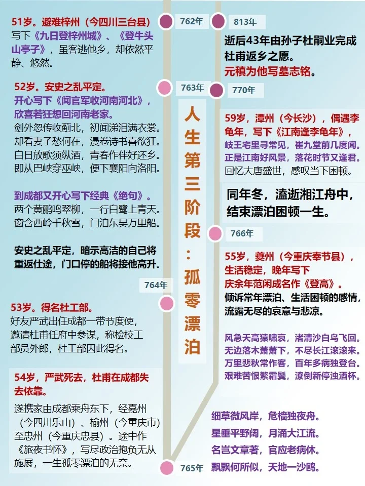 🍃安史之乱爆发,杜甫开始了十一年的漂泊生涯,先后到过江南、甘肃、四川、湖北、湖南等地,他一直过着颠沛流离、居无定所的生活,蕞后S在湘江的一条船上。